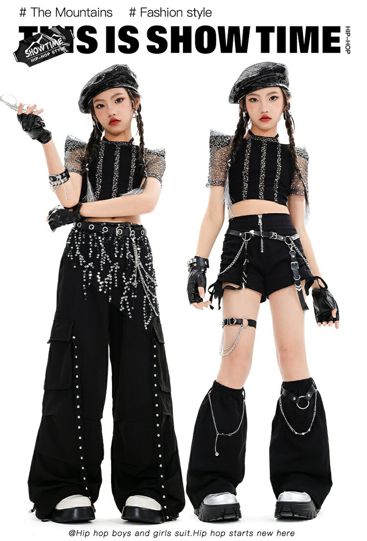 子供 ダンス衣装 ヒップホップ 黒 女の子 セットアップ キッズ キラキラ へそ出し 半袖 ロングパンツ 短パン レッグカバー キッズダンス 派手 おしゃれ 演出服 韓国 jazz hiphop k-pop ブラック ステージ衣装 練習着 110-180