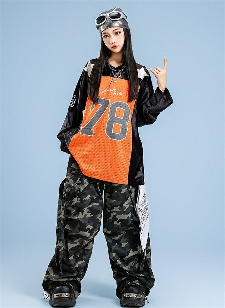 ダンス衣装 キッズ 迷彩柄 ヒップホップ ダンス 衣装 迷彩 パンツ セットアップ キッズ 男の子 女の子 KPOP ストリート系 ベースボールシャツ 長袖 発表会 練習着 団体服 かっこいい 上下セット