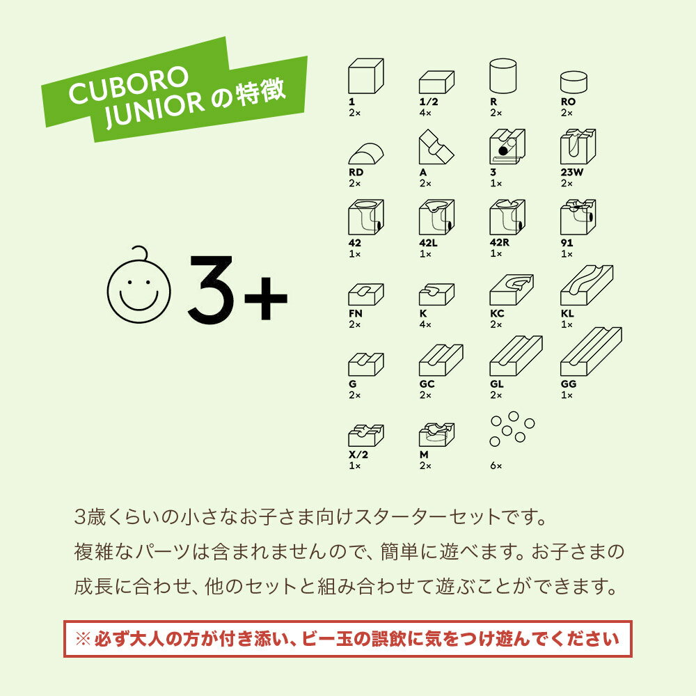 おもちゃ 玩具 知育 積み木 プレゼント クリスマス プレゼント 木のおもちゃ 女の子 男の子 1歳/2歳/3歳/4歳/5歳/6歳/7歳/8歳 知育玩具 クリスマス 入学祝 誕生日 幼稚園 小学生 小学校【CUBORO / JUNIOR(ジュニア)】 ジュニアは3歳以上の土台を組むことができるお子様向けの積み木です。 キューブの組み合わせで、玉の速さを変化させたり、さまざまな仕掛けを楽しむことが出来ます。 試行錯誤を通して三次元での構成力や理論的思考、集中力などが育ちます。 振り子の力で玉が弾かれ、坂道を勢いよくかけのぼります。 商品仕様 種類 積み木 素材 材質:ビーチ材(ブナ)無垢材、ガラス(ビー玉) 対象年齢 3歳〜 パーツサイズ 積み木基尺:縦50mm×横50mm×高さ5cm、ビー玉17mm セット内容 22種40ピース、ビー玉×6個 並行輸入品について 下記画像、商品画像のバナーを必ずご覧頂きご了承の上、ご購入くださいませ。 ※メーカーの都合により、予告なく仕様変更になる場合がございます。 お子様への 誕生日 クリスマス 卒園(卒業) 入園(入学) 祝いのプレゼント にもおすすめです。 男の子 女の子 おとこのこ おんなのこ キッズ 子供 子ども こども 男子 女子 小学生 小学校 一年生 ニ年生 三年生 四年生 五年生 六年生 1年生 2年生 3年生 4年生 5年生 6年生 低学年 高学年 1才 2才 3才 4才 5才 6才 7才 8才 9才 1歳 2歳 3歳 4歳 5歳 6歳 7歳 8歳 9歳 への クリスマス くりすます 誕生日 の 記念 バースデー プレゼント おもちゃ おもしろ グッズ 人気 ランキング