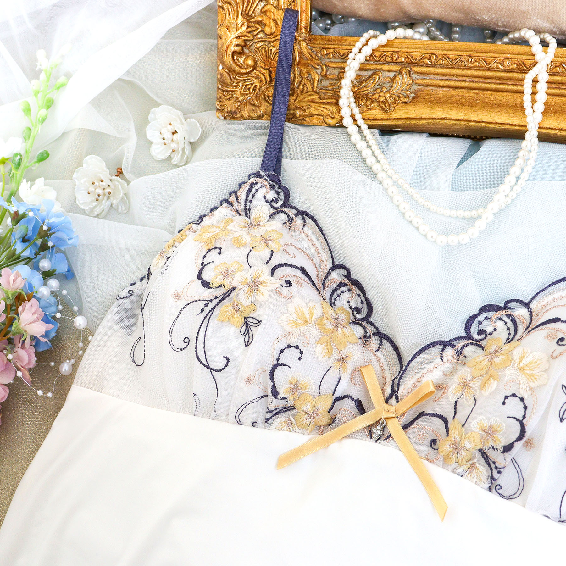 メーカー希望小売価格はメーカーカタログに基づいて掲載しています ↑ファイルサイズ大きめのカタログデータpdfになります↑【二輪草の幻想的なきらめきをまとって】咲きほこる二輪草をイメージしたお花と、ツタを表現した曲線をふんだんにあしらったシリーズです。二輪草はあたたかみのあるウーリー糸で刺繍して、やわらかく可愛らしい表情をプラス。対照的に色とりどりの曲線は太めのステッチやラメ糸、ドット柄をほどこすことで、ひときわ華やかな印象に仕上がりました。まるで二輪草が光に照らされているかのような、きらめきが幾重にも折り重なる、幻想的な世界観を表現しています。カップの中央にはキラキラと輝くストーンチャームをあしらいました。身生地はアシンメトリーなカッティングと、裾の幅広レースで大人の上品さを演出。ポイントでインパクトのあるアップリケをプラスしました。バックスタイルは小さなリボンをほどこした、デイリー使いしやすいベーシックなデザインに。色使いは全体的にはっきりとした配色で、おしゃれで豪華な印象の新しいリサマリをお楽しみいただけます。<アイテム特徴・着用感>身生地はすべりがよい素材を使用しており、さらりとした気持ちの良い着心地です。伸縮性があり、ご着用していてストレスを感じにくい仕様になっております。<サイズ>M:バスト 79〜87cm(総丈:60cm)L:バスト 86〜94cm(総丈:約60cm)<商品仕様>・ストラップ長さ調節可能(取り外し不可)・身生地の伸縮性:あり・取り外し可能薄手カップ付属(ウレタン製)<関連アイテム>お揃いのアイテムは以下よりご確認ください。・64510 ブラジャー(B・C)・64511 ブラジャー(D・E・F)・64512 ブラジャー(G・H・I)・74510 ノーマルショーツ・74511 レースショーツ・74512 リボンショーツ・74514 Tバック・74516 サニタリー・34511 カップ付キャミソール・24511 タップパンツ ブラジャー(B/C) ブラジャー(D/E/F) ブラジャー(G/H) ノーマルショーツ(M/L) レースショーツ(M/L) リボンショーツ(M/L) Tバック(M/L) サニタリーショーツ(M/L) カップ付キャミソール(M/L) タップパンツ(M/L) 当該商品は自社販売と在庫を共有しているため、在庫更新のタイミングにより在庫切れが発生する場合がございます。 在庫切れの場合、商品のキャンセルをお願いする場合がございます。 検索用キーワード:リサマリ RisaMagli レース 花柄 フラワー 刺繍 マスタード ピンク ブルー