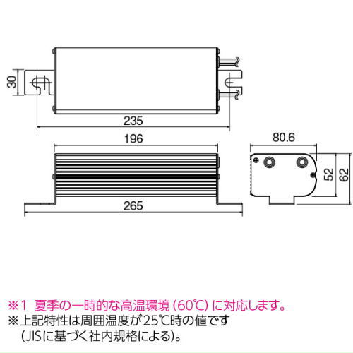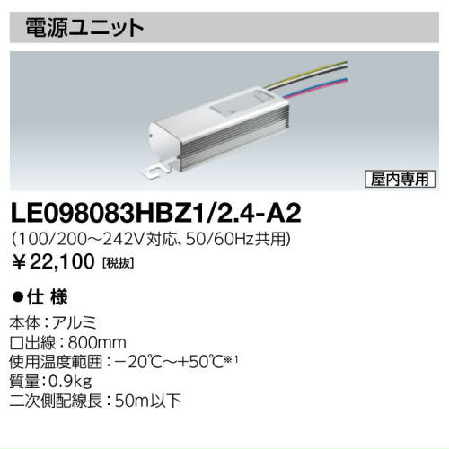 ●メーカー:岩崎 ●形番:LE098083HBZ1/2.4-A2 ●使用温度範囲:-20°C~+50°C(※夏季の一時的な高温環境(60度)に対応します) ●本体:アルミ ●口出線:800mm ●種類1:89W・98W・111W用 ●種類2:屋内専用 ●定格電圧:100/200~242V対応 ●定格周波数:50/60Hz共用 ●入力電流(100V時):1.00A(1.24A) ●入力電流(200V時):0.49A(0.60A) ●入力電流(242V時):0.41A(0.50A) ●二次無負荷電圧:200V(瞬時値) ●二次側配線長:50m以下 ●質量:0.9kg ●適合ランプ LEDioc LEDアイランプSP-W ・LDGS111L-H-E39/HB ・LDGS111N-H-E39/HB ・LDGS89L-H-E39/HB ・LDGS89N-H-E39/HB ・LDGS98L-H-E39/HB ・LDGS98N-H-E39/HB LEDioc LEDアイランプSP ・LDRS111L-H-E39/HB ・LDRS111N-H-E39/HB ・LDRS111N-H-E39/HB/850 ・LDRS89L-H-E39/HB ・LDRS89N-H-E39/HB ・LDRS89N-H-E39/HB/850 ・LDRS98L-H-E39/HB ・LDRS98N-H-E39/HB