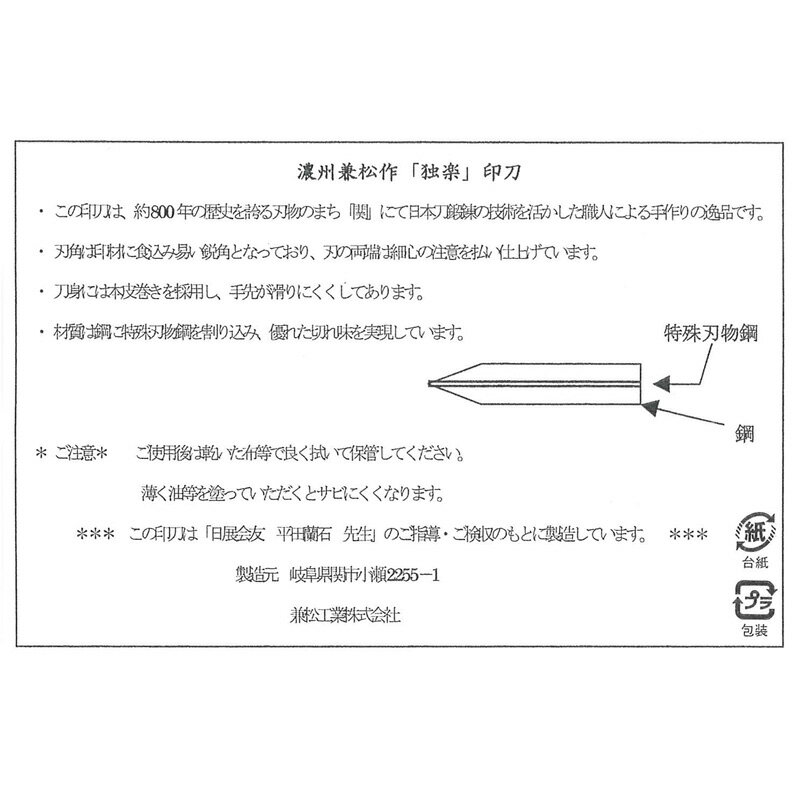 商品について 刃物で有名な関市で作られた印刀です。 この印刀は「日展会友 平田蘭石先生」のご指導・ご検収のもとに製造しています。 切れ味がよく丈夫で、鹿皮を巻いているため手にも優しい良品です。 ※ご使用後は乾いた布などで良く拭いて保管して下さい。 ※薄く油を塗っていただくとサビにくくなり、また砥石で磨けば繰り返し使用できます。 刃幅:10mm 長さ:165mm 材質:鋼/鹿皮 【関連商品】 濃州兼松印刀 両刃2mm 濃州兼松印刀 両刃4mm 濃州兼松印刀 両刃6mm 濃州兼松印刀 斜刃6mm 濃州兼松印刀 両刃8mm 濃州兼松印刀 両刃10mm 必ずお読みください ■送料について メール便:全国一律300円 宅配便:お届け先地域により異なります 詳細はこちらをご覧ください。 ■その他 返品についてはこちらをご覧ください。
