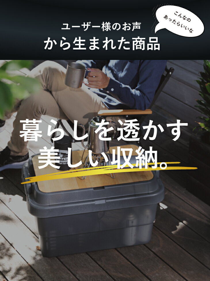 商品名 TRUNK CARGO -トランクカーゴ- クリア 商品説明 座れて、運べて、しっかり守る。 耐荷重100kgの頑丈設計で、収納ボックスとしてだけでなくベンチや踏み台としても安心して使えます。 フタにはロック機能付きの取手を採用。しっかり閉まり、中身がこぼれにくく、持ち上げるときも安定。 取手を握ってそのまま運べるので、模様替えや車への積み込みもラクラクです。 工具・衣類・アウトドア用品など、重たいものもまとめてすっきり収納。 丈夫で壊れにくい日本製ボディが、毎日の“しまう・使う・運ぶ”を支えます。 加工 シボ加工(さわり心地・滑り防止、汚れ(指紋)や傷を目立たなくする等の効果) カラー クリア / クリアブラック サイズ ■TC-50S 外寸:W600×D390×H357(mm) ■TC-50S LOW 外寸:W600×D390×H240(mm) 製品重量 ■TC-50S:2646g■TC-50S LOW:2316g 耐荷重 (約)100kg 容量 ■TC-50S:50L■TC-50S LOW:30L 材質 PP(ポリプロピレン) 原産国 日本 容量違いはこちら 【トランクカーゴ・スタッキングタイプ】 トランクカーゴ TC-20S トランクカーゴ TC-30S トランクカーゴ TC-50S トランクカーゴ TC-70S 【トランクカーゴ・ロー(浅型)タイプ】 トランクカーゴ TC-30S LOW トランクカーゴ TC-50S LOW トランクカーゴ TC-70S LOW 【トランクカーゴ・スタンダードタイプ】 トランクカーゴ TC-20 トランクカーゴ TC-30 トランクカーゴ TC-50 トランクカーゴ TC-70 シーン・関連ワード 日本製 机 テーブル リス リスオンラインショップ リス株式会社 RISU 椅子 チェア ラック 調理台 コンパクト 大人 人気 軽い 大容量 道具 屋外 野外 室内 おすすめ オススメ おしゃれ オシャレ かっこいい カッコいい 小物 軽量 ステッカー ファミリー 家族 ソロ 一人 台 机 ツールボックス 大型 女子 女性 男子 男性 用品 大きい ベンチ 遊び 車 車内 トランク 緑色 緑 オリーブドラブ オリーブ カーキ 灰色 灰 黒色 黒 camp outdoor 頑丈 BOX green gray black キャンプ場 登山 山 海 釣り 持ち物 あると便利 便利グッズ ブランド メーカー バーベキュー BBQ diy 雨 雨の日 服 衣装 衣類 ギア グッズ グランピング 必要 必需品 春 夏 秋 冬 初心者 荷物 積載 ルーフボックス ルーフキャリア 防災 棚 座れる 丈夫 ミリタリーTRUNK CARGO座れて、運べて、しっかり守る。 耐荷重100kgの頑丈設計で、収納ボックスとしてだけでなくベンチや踏み台としても安心して使えます。 フタにはロック機能付きの取手を採用。しっかり閉まり、中身がこぼれにくく、持ち上げるときも安定。 取手を握ってそのまま運べるので、模様替えや車への積み込みもラクラクです。 工具・衣類・アウトドア用品など、重たいものもまとめてすっきり収納。 丈夫で壊れにくい日本製ボディが、毎日の“しまう・使う・運ぶ”を支えます。 キャンプ アウトドア camp outdoor 収納ケース 収納ボックス工具ボックス 屋外ストッカー 防災グッズ ふた付き 収納BOX