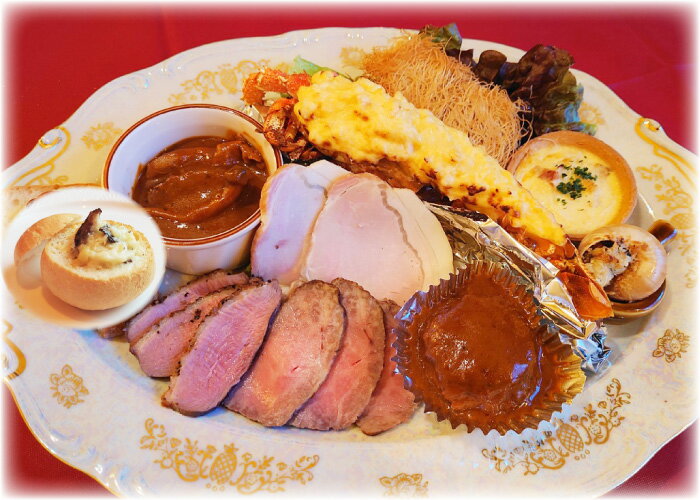 年末年始 洋食セット 1人前 内容量 ・ローストビーフ 3枚 グレイビーソース付き 約60g ・ロースハム 2枚 約70g ・小さなトリュフのグラタン 1個約30g ・カモのロースト 3枚 マデラソース付き 約45g ・エスカルゴ 1個約30g ・テルミドール 1本 約175g ・真鯛のカダイフ仕立て 1個 約80g ・キッシュ 1個 直径約7.5cm 約80g ・ビーフシチュー 約200g ・煮込みハンバーグ 約180g ・おまけ:イタリアンプリン1個 約61g 原材料 【ローストビーフ】 牛肉・塩・香辛料・玉ねぎ・人参・セロリ・調味料(アミノ酸等)・ワイン 【自家製ハム】 豚肉(長野県産)・玉ねぎ・人参・セロリ・ニンニク・塩・香辛料・調味料(アミノ酸等)・キャベツ・酢・砂糖 【小さなトリュフのグラタン】 小麦粉・牛乳・トリュフ・玉ねぎ・バター・生クリーム・卵黄 【カモのロースト】 鴨肉・塩・香辛料・調味料(アミノ酸等)・ワイン・玉ねぎ・人参・エシャロット・マデラ酒・フォン ※一緒におつけする「マデラソース」の原材料も含まれています。 【エスカルゴ】 エスカルゴ(フランス産)、バター、ニンニク、 パセリ、エシャレット、パン粉、チーズ、塩、香辛料・調味料(アミノ酸等) 【テルミドール】 ロブスター・玉ねぎ・小麦粉・牛乳・バター・生クリーム・チーズ・白ワイン・塩・香辛料・調味料(アミノ酸等) 【真鯛のカダイフ仕立て】 真鯛・カダイフ・小麦粉・マーガリン・塩・香辛料・調味料(アミノ酸等)・白ワイン・生クリーム・牛乳・エシャロット・玉ねぎ・サフラン・レモン果汁 ※一緒におつけするソースの原材料が含まれています。 【キッシュ】 小麦粉・マーガリン(乳成分を含む)・砂糖・卵・香料・乳化剤(大豆由来)・膨張剤・牛乳・豚肉・玉ねぎ・きのこ(しめじ等)・チーズ・パセリ 【ビーフシチュー】 牛肉(国産)、玉ネギ、きのこ(ヒラタケ等)、デミグラスソース〔フォン香味野菜(玉ねぎ、ニンジン、セロリ等)赤ワイン、トマトピューレ、ケチャップ、塩、香辛料〕、調味料(アミノ酸等)生クリーム、醤油(大豆、小麦を含む)、調味料(アミノ酸等) 【煮込みハンバーグ】 国産牛肉、豚肉、玉ねぎ、卵、キノコ、デミグラスソース、生クリーム、醤油(大豆、小麦を含む)、塩、香辛料、調味料(アミノ酸等) 【イタリアンプリン】 牛乳・全卵・砂糖・水あめ・チョコレート・カラメルソース・ゼラチン・加糖練乳・ナチュラルチーズ・ブドウ糖・寒天・トレハロース・乳化剤・香料 ※画像は店舗でお出ししているスタイルです。 お届けする商品とは形等、若干異なります事、ご了承下さいませ。※画像は店舗でお出ししているスタイルです。お届けするお料理とは若干異なります事、ご了承下さい。 『自家製ロースハム』2枚 「信州オレイン豚」のロース肉を使用。香味野菜と塩で10日間漬け込み、その後 塩抜き・風にさらし、桜チップで4~5時間じっくり燻製しボイルして仕上げました。 手間暇を惜しまず、豚肉の旨みが最大限に引き出されたロースハムは絶品です!! 『ちっちゃなパンに入ったトリュフのグラタン』1個 イタリア産のトリュフを使用した香り豊かなグラタン! 手のひらサイズの可愛らしい小さなパンの中に贅沢をぎゅっと閉じ込めました。 サクサクなパンの食感と、口に広がるトリュフの豊かな香りをお楽しみください。 『ローストビーフ』3枚 信州の自然豊かな環境で育てられた『信州プレミアム牛』のもも肉を使いジックリ、 こんがり焼き上げたローストビーフは絶品♪グレイビーソース付きです。 『自家製ベーコンときのこのキッシュ』1個 自家製ベーコンは信州オレイン豚バラ肉を使用。ベーコンときのこ、玉ねぎをバターでジックリ炒め、オリジナルのアパレイユと合わせて小さなタルトカップに入れ焼き上げました。 『エスカルゴ ブルゴーニュ風』1個 フレンチの最高級食材と言われている「エスカルゴ」上質のバターにニンニクやパセリを加えたブルゴーニュ風バターを詰め、グツグツと焼き上げました。にんにくの香りがたまらない一品! 『ハンガリー産マグレ鴨 のロースト』3枚 フォアグラを採取するために肥育したカモで、芳醇な香りと濃厚な旨味と甘みのある脂が特徴。ほんのり甘いマデラ酒のソースがカモによく合います♪ ※写真はイメージです。カモ肉は3枚となります。 『真鯛のカダイフ仕立て』 1つ 金沢直送の天然真鯛を使用!(※) サクサクとした食感が楽しいカダイフ仕立て。お魚料理と合うサフランのソース付き ※鯛は天然もののため、不漁等で獲れない場合は別の魚になる場合がございます。 『テルミドール』1本 1本を半分に割って、身を取り出しカットして半日かけて作るホワイトソースと合わせ殻にたっぷり入れた贅沢なグラタン。 美味しく召し上がって頂く為に少しお手をとらせてしまいますがオーブン(トースター)で焦げ目がつく程度に焼いてお召し上がり下さい! 『煮込みハンバーグ』約180g ハンバーグはお肉の食感が残るように粗挽きにしたミンチを使っているから「食べ応えばっちり!!」一つ