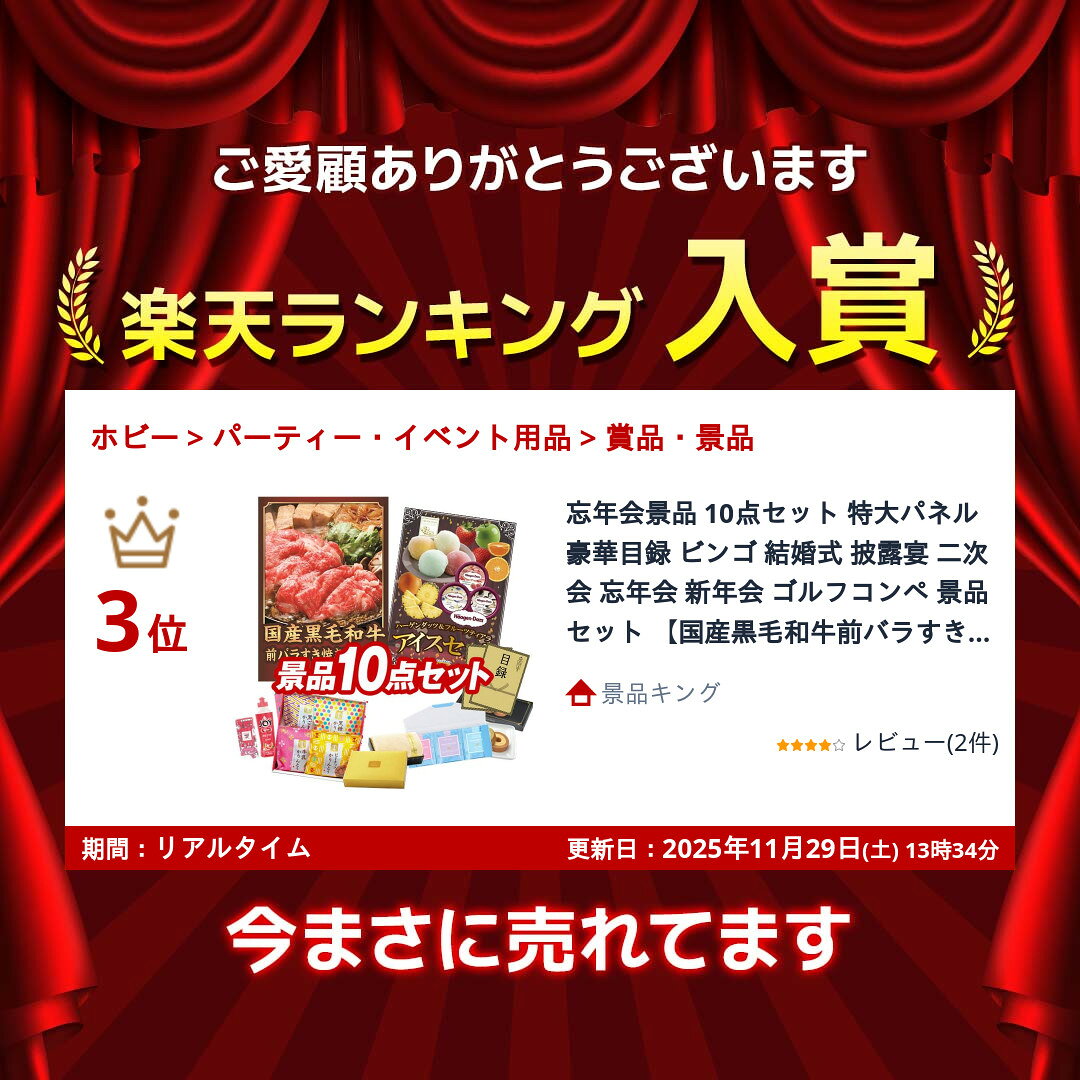 ランキング受賞★ 忘年会景品 10点セット 特大パネル 豪華目録 ビンゴ 結婚式 披露宴 二次会 忘年会 新年会 ゴルフコンペ 景品セット 【国産黒毛和牛前バラすき焼き用300g、ハーゲンダッツ&フルーツティアラアイスセット】
