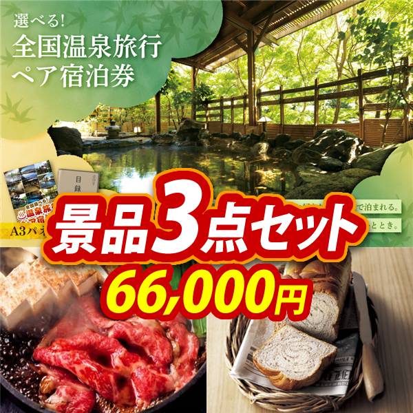 ★ポイント12倍★要エントリー!忘年会景品 3点セット 特大パネル 豪華目録 ビンゴ 結婚式 披露宴 二次会 忘年会 新年会 ゴルフコンペ 景品セット 【選べる!全国温泉旅行ペア宿泊券、国産黒毛和牛前バラすき焼き用300g】 送料無料 特大パネル 豪華目録付き