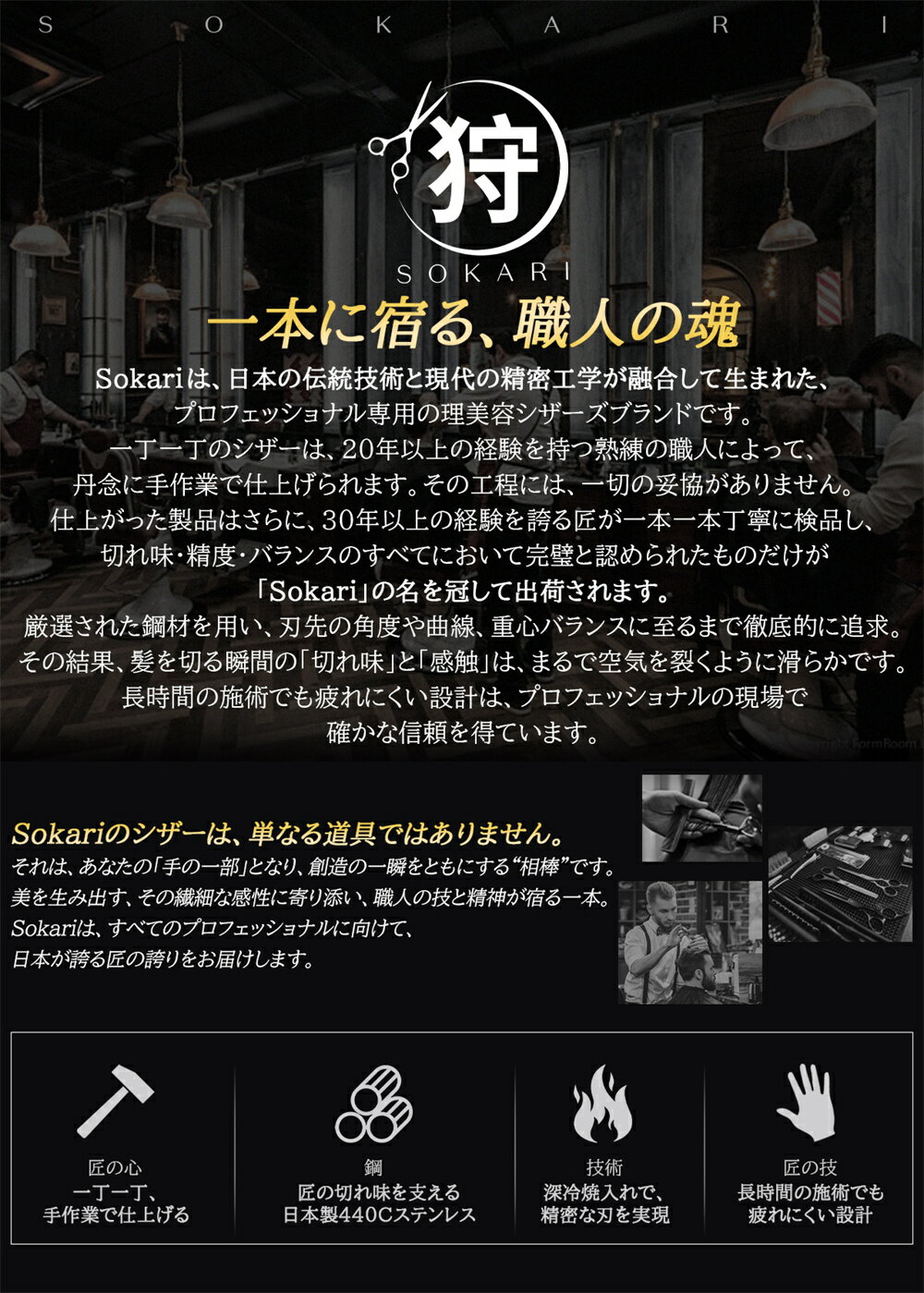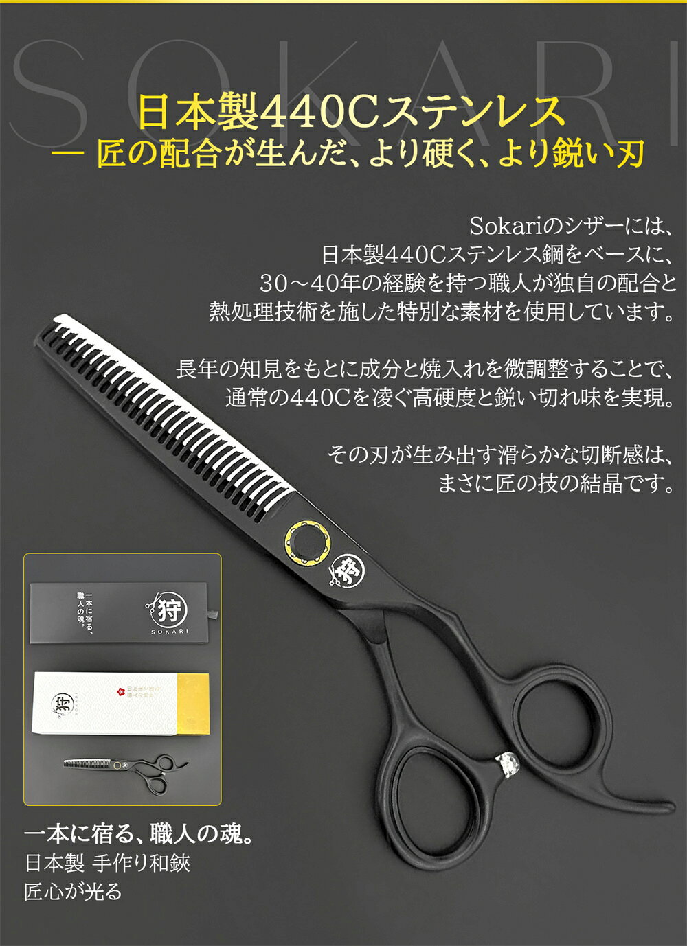 一本に宿る、職人の魂。 Sokariは、日本の伝統技術と現代の精密工学が融合して生まれた、プロフェッショナル専用の理美容シザーズブランドです。 一丁一丁のシザーは、20年以上の経験を持つ熟練の職人によって、丹念に手作業で仕上げられます。その工程には、一切の妥協がありません。 仕上がった製品はさらに、30年以上の経験を誇る匠が一本一本丁寧に検品し、切れ味・精度・バランスのすべてにおいて完璧と認められたものだけが「Sokari」の名を冠して出荷されます。 厳選された鋼材を用い、刃先の角度や曲線、重心バランスに至るまで徹底的に追求。その結果、髪を切る瞬間の「切れ味」と「感触」は、まるで空気を裂くように滑らかです。長時間の施術でも疲れにくい設計は、プロフェッショナルの現場で確かな信頼を得ています。 ★鋼材について – About the Steel★ 日本製 440C ステンレス鋼 – 匠の切れ味を支える素材 Sokariのシザーは、日本製 440C ステンレス鋼 を使用しています。 440Cは、高炭素・高クロムを含むマルテンサイト系ステンレス鋼で、優れた硬度、耐摩耗性、耐腐食性 を兼ね備えた高品質素材です。 熟練した職人の熱処理と精密研磨により、刃先は驚くほど滑らかで鋭く仕上げられ、髪を切る瞬間の感触は、まるで空気を裂くように軽やかです。 高い硬度(HRC58〜60)によって、長時間使用しても刃こぼれしにくく、鋭い切れ味を持続させます。また、ステンレス特有の耐錆性により、日常のサロンワークにおいても優れた安定性を発揮します。 Sokariが選ぶ440Cは、「切れ味」「耐久性」「美しさ」 の三拍子を兼ね備えた、まさにプロフェッショナルのための素材です。 ★ご注意事項(お買い上げ前に必ずご確認ください)★ Sokariのシザーは、精密な技術と職人の手仕事により一本一本丁寧に仕上げられた、プロフェッショナル専用の高品質な理美容用シザーです。末永く快適にご使用いただくために、以下の点にご注意ください。 【ご使用に関して】 本製品は理美容師・トリマー・プロフェッショナル向けのシザーです。一般の方がご使用になる際は、十分ご注意ください。 落下や衝撃により刃が欠けたり、切れ味が低下する場合があります。お取り扱いにはご注意ください。 ご使用後は水分・毛くずなどをよく拭き取り、乾いた布で清潔に保管してください。 潤滑油を定期的に刃元(ヒットポイント部分)に差すことで、切れ味を長持ちさせることができます。 本製品は子供や十分な経験・知識のない方には使用させないでください。使用する場合は、必ず責任ある大人の指導または監督の下で行ってください。 子供がシザーに触れたり遊んだりしないよう、必ず監督してください。 【メンテナンス・保管について】 使用後は必ず専用ケースまたは安全な場所に収納してください。 錆びの原因となるため、湿気の多い場所での保管はお避けください。 定期的なメンテナンス(研ぎ直し)は、専門の研ぎ職人・メーカーサービスをご利用ください。 【ご購入前の確認】 商品ページのサイズ・材質・用途をよくご確認の上ご購入ください。 商品画像はイメージです。実際の色味・質感はモニター環境により多少異なる場合があります。 商品の仕様は品質向上のため、予告なく変更する場合がございます。 【安全上のご注意】 人体や動物の皮膚を直接切る用途には使用しないでください。 使用中に異常(刃のがたつき・引っかかり等)を感じた場合は、直ちに使用を中止してください。 【環境・品質について】 当製品は新潟県燕三条地域の工場で製造(または監修)された高品質なシザーです。 一丁ずつ職人による手仕上げのため、仕上がりに個体差が生じる場合がございます。