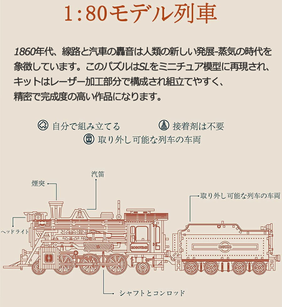 立体パズル 大人 子供 ウッドパズル ROKR 3Dウッドパズル 木組み パズル 蒸気機関車 自走する モデル 対象年齢14+ 親子 DIY オルゴール 誕生日 プレゼント ギフト 説明書付き MC501