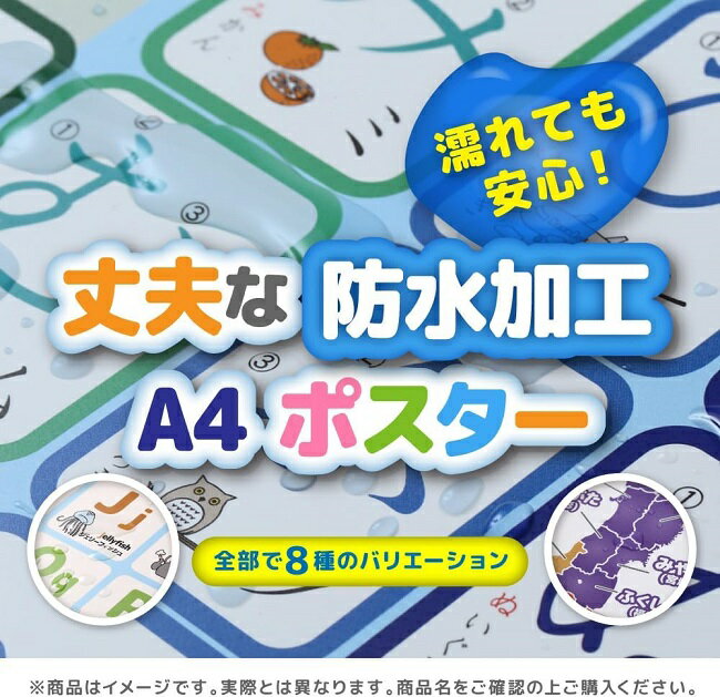 A4サイズ (297×210mm) 日本製 【ご使用時の注意】※必ず保護者の方がお読みください ・ご使用の際は、お子さまがシートにつまずいたり、滑ったりしないよう十分にご注意ください。 ・本製品は浴室の壁に貼って使用する学習用ポスターです。床面には絶対に置かないでください。転倒など思わぬ事故につながる恐れがあります。 ・お子さまがシートを口に入れたり、破損した部分で手を切らないよう、常に保護者の目の届く場所でご使用ください。 ・火のそばや高温になる場所には近づけないでください。変形・変色・変質の原因となります。 ・使用後は水気を拭き取り、よく乾かしてから保管してください。濡れたまま保管すると、カビや臭いの原因になります。 ・壁面の材質によってはポスターが貼り付きにくい場合があります。あらかじめ目立たない場所でお試しください。 【お願い】 ・ポスター本体は折り曲げたり丸めたりしないでください。壁にしっかり貼り付きにくくなる原因となります。 ・貼り付け面やポスターの裏面にホコリや汚れがあると、吸着力が落ちます。清潔な状態でご使用ください。 ・長期間同じ場所に貼り続けると、壁に跡が残る可能性があります。定期的に貼る位置を変えることをおすすめします。 ・凹凸のある壁面や木材、土壁、コンクリート、塩化ビニールなどの素材には貼り付きません。浴室の平らで滑らかな面にご使用ください。 ・シールのように粘着剤はついていませんので、吸着力が弱まった場合は、水で裏面を軽く濡らしてから貼り直してください。 【使い方】 ・シートの裏面にお湯または水をかけ、中央部分から空気を逃しながら、お風呂の平らな壁面に貼ります。 表面が乾くと、壁面からはがれやすくなりますので、裏面に湿り気がある状態で貼ってください。 ・使用後は壁面からはがして保管願います。※モニターによって実際の商品と色が異なって見える場合がございます。 A4サイズ (297×210mm) 日本製 【ご使用時の注意】※必ず保護者の方がお読みください ・ご使用の際は、お子さまがシートにつまずいたり、滑ったりしないよう十分にご注意ください。 ・本製品は浴室の壁に貼って使用する学習用ポスターです。床面には絶対に置かないでください。転倒など思わぬ事故につながる恐れがあります。 ・お子さまがシートを口に入れたり、破損した部分で手を切らないよう、常に保護者の目の届く場所でご使用ください。 ・火のそばや高温になる場所には近づけないでください。変形・変色・変質の原因となります。 ・使用後は水気を拭き取り、よく乾かしてから保管してください。濡れたまま保管すると、カビや臭いの原因になります。 ・壁面の材質によってはポスターが貼り付きにくい場合があります。あらかじめ目立たない場所でお試しください。 【お願い】 ・ポスター本体は折り曲げたり丸めたりしないでください。壁にしっかり貼り付きにくくなる原因となります。 ・貼り付け面やポスターの裏面にホコリや汚れがあると、吸着力が落ちます。清潔な状態でご使用ください。 ・長期間同じ場所に貼り続けると、壁に跡が残る可能性があります。定期的に貼る位置を変えることをおすすめします。 ・凹凸のある壁面や木材、土壁、コンクリート、塩化ビニールなどの素材には貼り付きません。浴室の平らで滑らかな面にご使用ください。 ・シールのように粘着剤はついていませんので、吸着力が弱まった場合は、水で裏面を軽く濡らしてから貼り直してください。 【使い方】 ・シートの裏面にお湯または水をかけ、中央部分から空気を逃しながら、お風呂の平らな壁面に貼ります。 表面が乾くと、壁面からはがれやすくなりますので、裏面に湿り気がある状態で貼ってください。 ・使用後は壁面からはがして保管願います。