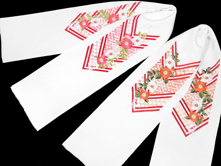 半襟 刺繍 半衿 振袖 成人式 矢羽根 辻ケ花文様 日本製 京都 白 赤 黒 橙 桃 レディース 卒業式 袴 フォーマル 送料無料 W22 オリジ u709 Si ◆寸法 長 さ:115cm 幅 :16.5cm ◆用途 振袖や成人式の袴にお使いいただけます。 ◆素材 日本製(京都) 生地:ポリエステル100% 刺繍糸上糸:レーヨン100% 刺繍糸上糸(金):ナイロン55% ポリエステル45% ◆色 1番:黒地に赤、白、金刺繍 2番:白地に金刺繍 3番:白地に白刺繍 4番:白地に橙の濃淡、老松、アクセントの金刺繍 5番:白地に赤、桃の濃淡、若葉色、アクセントの金刺繍 ◆商品説明 豪華な古典文様の刺繍を施した、大変美しい振袖用半衿です。 おしゃれな市松や縁起の良い紗綾形をあしらった大きな矢羽根に、繊細な辻ケ花文様を表したデザインのお品です。 曲線の優美な辻ケ花は華やかで女性らしい柔らかさを感じさせ、そこに矢羽根の意匠がモダンなおしゃれ感を添えています。 生地は正絹風の艷やかな光沢と張りのあるなめらかな肌触りです。 豪華さも併せ持っていますので、お祝いのお席にふさわしいアクセントになります。 古典文様のお着物と特に相性良く合わせられ、胸元に個性を添えて、お着物姿を一際美しく、気品あふれる印象にみせてくれます。 振袖、卒業式の袴姿、訪問着などの半衿を刺繍に変えるだけで着物姿が見違える程お洒落になりますし、 結婚式や成人式などお祝いのお席をより一層華やかに演出してくれること請け合いです。◆おすすめ商品◆ 半衿 帯締め 帯揚げ 草履バッグ