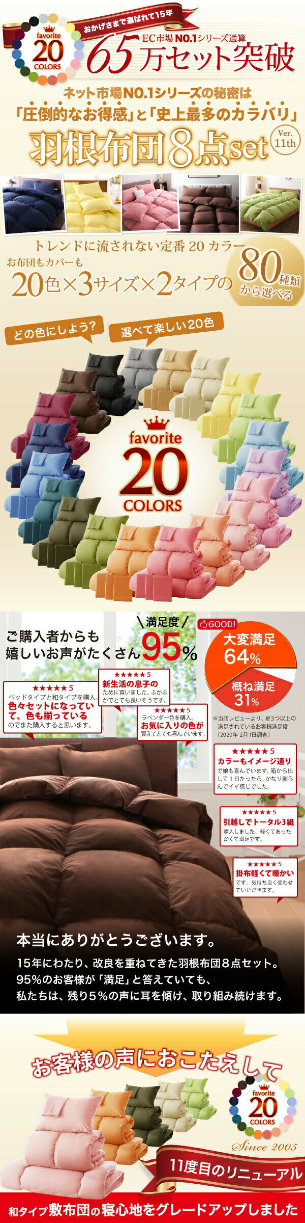 ★o。:・;;.。:*・☆o。:・;;.。:*・☆o。:・;;.。:*・★o。 オールシーズン使える、ふわふわの羽根布団8点セット! ご購入者65万人の声をもとに、完全リニューアル!! 機能充実な8点セット(ダブル11点セット)は、必要なものがすべて揃っていて、オドロキ価格で届いたその日からスグに使える! 一人暮らし、子供部屋、急に来客でも慌てなし・・・ <ベッドタイプ 和タイプ シングルサイズ 布団8点セット 内容> 1)掛け布団:150×210cm・1.5kg・8ヵ所ループ付き フェザー100% 綿100% 2)ベッドタイプ/敷バット:100×200cm・0.4kg・四隅ゴムバンド付き ポリエステル100% 和タイプ/敷布団:100×210cm・2.6kg ウレタンフォーム ポリエステル100% 3)枕:43×63cm・0.5kg ポリエステル100% 4)同色掛け布団カバー:150×210cm ポリエステル100% 5)ベッドタイプ/ボックスシーツ:100×220+厚みマチ25cm ポリエステル100% 和タイプ/ファスナー式カバー:110×220cm ポリエステル100% 6)同色枕カバー2枚:43×63cm ポリエステル100% 7)専用収納ケース 不織布 ◇送料:北海道・沖縄・離島除く送料無料 ◇発送:平日2日前後発送