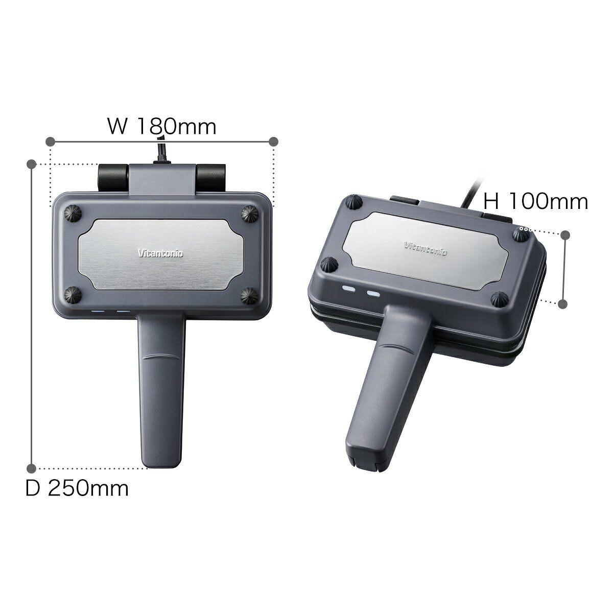 Vitantonio / エッグワッフル&ホットサンドベーカー 人気の香港スイーツが作れる ホットサンドメーカー 『 Vitantonio エッグワッフル&ホットサンドベーカー 』は、カリッモチッとした食感が魅力の香港のローカルスイーツ、バブルワッフルがおうちで作れる本格派キッチン家電。プレートを変えれば食パン1枚で三角のハーフホットサンドが耳まで焼ける、コンパクトなホットサンドメーカーにも。エッグワッフルメーカー・ホットサンドメーカーとして使える基本セットと、たい焼きメーカーとしても使えるポワソンプレート付きの店舗限定セットからお選びいただけます。 スペック Vitantonio エッグワッフル&ホットサンドベーカー 基本セット( プレート2種 ) 品番 / JANブラック:VEH-10-K / 4968291315011 セット内容本体、プレート2種類( エッグワッフルプレート、ホットサンドプレート )、レシピブック、取扱説明書( 保証書含む ) Vitantonio エッグワッフル&ホットサンドベーカー 店舗限定セット( プレート3種 ) 品番 / JANブラック:VEH-10-K-P / 4968291315226 セット内容本体、プレート3種類( エッグワッフルプレート、ホットサンドプレート 、ポワソンプレート )、レシピブック、取扱説明書( 保証書含む ) 備考たい焼きのサイズ:約 幅 125mm×奥行き 70mm ※当店調べ 共通事項 サイズ約 幅 180mm×奥行き 250mm×高さ 100mm 重さ約 1.3kg( エッグワッフルプレート含む ) 素材本体:フェノール樹脂、ステンレスプレート:フッ素樹脂加工アルミダイキャスト コードの長さ約 1m 電源AC100V 50/60Hz 消費電力800W 機能・着脱式プレート・適温&通電ランプ 保証期間メーカー保証1年 お手入れ [ プレート ] ・本体から取り外して洗えます。 ・台所用中性洗剤と柔らかいスポンジで洗い、よくすすいで乾かしてください。 ・食器洗浄乾燥機や熱湯には対応していません。 ・みがき粉やナイロンたわし、金属たわしなどは使用しないでください。 ・使用中のプレートおよびプレートロックは大変熱くなります。プレートの取り外しは本体が十分冷めたあと、下側のプレートから先に行ってください。 [ その他 ] ・着脱式プレート以外は洗えません。 ・本体外側、遮熱板、ヒーターは台所用中性洗剤を薄めたぬるま湯を柔らかい布に含ませて、固く絞って拭き取ってください。 調理について [ エッグワッフル ] ・生地にザラメ、砂糖やチョコレートチップなどを混ぜると焦げやすくなりますのでご注意ください。 ・焼き上がったワッフルに砂糖やはちみつ、シロップなどをかけて焼きなおすことはできません。プレートの損傷、焼きムラ、こびりつきの原因になります。 [ ホットサンド ] ・食パンは8~16枚切りが適しています。6枚切りより厚い食パンでは本体に負担がかかることがあります。 ・予熱 約 4分+焼き上がり目安時間は約3分~4分です。 備考 ・エッグワッフルのサイズ:約 幅 155mm×奥行き 76mm ※当店調べ ・本製品は肉、野菜、麺類などを直接調理するホットプレートのような使い方はできません。 ・水のみ、卵液のみなど極端に液体に近い食材をプレートに入れて加熱しないでください。 ・加熱時間はあくまで目安です。食材や気温などに合わせて調理してください。タイマー機能はありません。 禁止事項・紙製焼き型の使用:硫酸紙、クッキングシート、ケーキミックス用など。・鋭利な金属の使用:ナイフやフォーク、金串など。・長時間の連続使用:連続して調理する場合は「 5回 」または「 1時間程度 」までとし、使用後は30分~1時間程度休ませてください。 ご注意点 ※製品仕様やパッケージは改良のため予告なく変更される場合があります。 ※サイズや色味は個体により若干の差異が生じることがあります。 ※商品の色は、画面上の画像と実物とでは多少異なる場合があります。あらかじめご了承のうえ、お買い求めください。 ※本体を壁やコーナーから20cm以上離してご使用ください。 ※はじめて使用する際にプレートやヒーターからにおいや煙が出ることがありますが、故障ではありません。 ※収納時に電源コードを本体に巻き付けないでください。故障や事故の原因になることがあります。Vitantonio ビタントニオ エッグワッフル&ホットサンドベーカーVEH-10-K / VEH-10-K-P 基本セット( プレート2種 )/ 店舗限定セット( プレート3種 ) 人気の香港スイーツが作れるホットサンドメーカー 『 Vitantonio エッグワッフル&ホットサンドベーカー 』は、カリッモチッとした食感が魅力の香港のローカルスイーツ、バブルワッフルがおうちで作れる本格派キッチン家電。プレートを変えれば食パン1枚で三角のハーフホットサンドが耳まで焼ける、コンパクトなホットサンドメーカーにも。エッグワッフルメーカー・ホットサンドメーカーとして使える基本セットと、たい焼きメーカーとしても使えるポワソンプレート付きの店舗限定セットからお選びいただけます。 Point エッグワッフルが作れる 大人気の「 Vitantonio ワッフル&ホットサンドベーカー 」シリーズに『 エッグワッフル&ホット