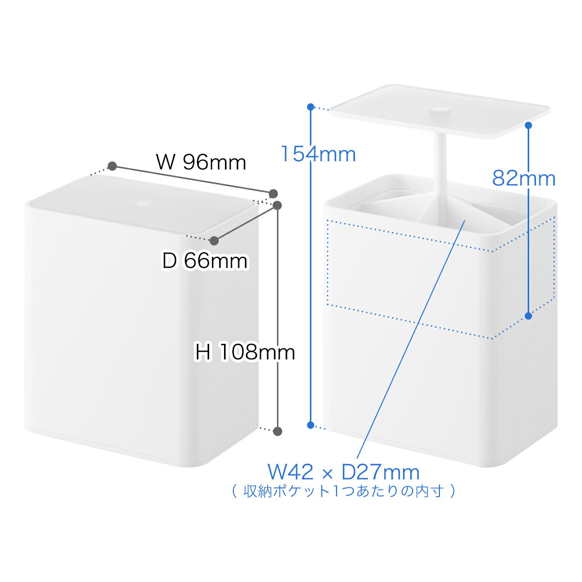 ポップアップ式綿棒ケースタワー ワンタッチで取り出しやすい プッシュ式綿棒ケース 『 tower( タワー )ポップアップ式綿棒ケース 』は、ワンプッシュで取り出しやすい綿棒収納ケース。蓋を押すだけで中が持ち上がり、綿棒の先端に触れずに衛生的に取り出すことができます。蓋は半透明で残量が確認しやすく、取り外せるので補充もラクラク。中は4つに区切られているから、綿棒の残りが少なくなっても倒れにくいのが◎。洗面所で歯間ブラシやピンセットなどケア用品の収納に、キッチンで爪楊枝入れとして使うのもおすすめ。生活感を隠してスマートに収納できます。 スペック 品名 tower( タワー )ポップアップ式綿棒ケース 品番 / JAN ホワイト:10284 / 4903208102841 ブラック:10285 / 4903208102858 サイズ 外寸:約 幅 96mm×奥行き 66mm×高さ 108mm 収納ポケット内寸:約 高さ 82mm 収納数の目安 一般的な綿棒:約 200本 ※サイズや形状によっては収納できない場合があります。 重さ 約 165g 素材 本体:ABS樹脂、ポリプロピレン クッション:シリコーンゴム お手入れ ・表面のホコリは柔らかく繊維の細かな布で軽く払ってください。 ・汚れが気になる場合は、中性洗剤を含ませた柔らかいスポンジで洗い、よくすすいだあと、水分をしっかり拭き取り乾かしてください。 ・タワシ、磨き粉、シンナー、ベンジン、アルコール、漂白剤、アルカリ性洗剤などは使用しないでください。 備考 ・綿棒などは付属しません。 ・乱雑に入れるとフタと容器の間に綿棒が挟まる場合があります。本数や綿棒の向きを調整して収納してください。 ・収納物の本数が少ない場合、フタを開けた反動で収納物が飛び出す場合があります。定期的に収納物を補充してください。 ご注意点 ※製品仕様やパッケージは改良のため予告なく変更される場合があります。 ※サイズや色味は個体により若干の差異が生じることがあります。 ※商品の色は、画面上の画像と実物とでは多少異なる場合があります。あらかじめご了承のうえ、お買い求めください。 ※収納物のサイズや量によっては、取り出しにくいことがあります。 ※殺菌力のある強い酸性・アルカリ性の薬品を多量に含む液体、アルコール類、石油類、除光液、香水、薬用ソープ、粘度の高い物、粒状の物が混合されている液体、レモン等の柑橘類の皮に含まれるテルペンや油脂などは、製品が変質することがあるので使用しないでください。 ※不安定な場所、直射日光が当たる場所や火の近く、高温になる場所、小さなお子さまやペットが触れる場所、屋外では使用しないでください。 山崎実業 公式 オンラインショップ tower(タワー)について 1971年に奈良県生駒郡で創業した、インテリア雑貨メーカー「山崎実業」。“ワクワクする心に従い行動する”という理念のもと毎日の暮らしが便利で快適になるアイデアを生み出し、シンプルかつ機能的なアイテムを次々と生み出しています。創業60年を超え、「ヤマジツ」の愛称で親しまれながらファンを増やし続けています。 様々なシリーズの中でも、圧倒的な商品数と高い知名度を誇る「towerシリーズ」。人気の秘密は、インテリアに溶け込むシンプル&モダンなデザインと、生活に寄り添う便利なアイデア商品。キッチン、リビング、バスルーム、玄関など、家中のアイテムをタワーシリーズで揃えたくなるような豊富な商品バリエーションです。tower タワー( 山崎実業 ) ポップアップ式綿棒ケース 10284 / 10285 ワンタッチで取り出しやすいプッシュ式綿棒ケース 『 tower( タワー )ポップアップ式綿棒ケース 』は、ワンプッシュで取り出しやすい綿棒収納ケース。蓋を押すだけで中が持ち上がり、綿棒の先端に触れずに衛生的に取り出すことができます。蓋は半透明で残量が確認しやすく、取り外せるので補充もラクラク。中は4つに区切られているから、綿棒の残りが少なくなっても倒れにくいのが◎。洗面所で歯間ブラシやピンセットなどケア用品の収納に、キッチンで爪楊枝入れとして使うのもおすすめ。生活感を隠してスマートに収納できます。 Point 片手でサッと開閉できる スマートな小物収納用品が豊富に揃う山崎実業から、サッと取り出しやすい綿棒入れが登場。フタを上から軽く押すだけで開き、閉めるときもカチッと音がするまで押し込むだけ。メイク中などで片手がふさがっていても取り出しやすいから、プチストレスを軽減。洗面所で気になる水濡れやホコリを防いで、清潔に保管できます。 取り出しやすく衛生的 フタを押すと飛び出すように中が持ち上がるので、綿棒の柄の部分をつまんで取り出しやすいのが◎。先端に触れることなく、衛生的に使うことができます。 倒れても中身が出にくい フタは上からプッシュすることで開く構造だから、うっかり倒してしまっても開きにくく、中の綿棒が散らばらないので安心です。 Point 生活感を隠して収納 どんなインテリアにもすっきりとなじむ、シンプルデザインも魅力。生活感が出やすい小物も