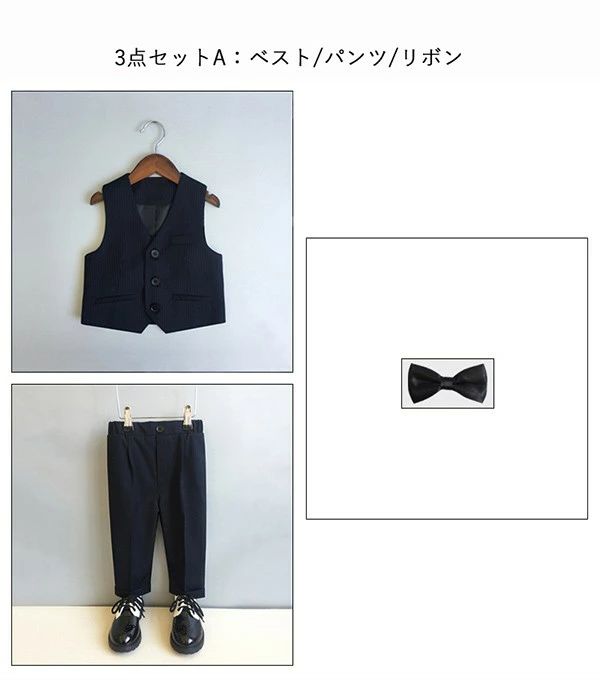 セット内容 .♔꙳∴ 3点セットA:ベスト/パンツ/リボン3点セットB:ジャケット/パンツ/リボン +別途2180円4点セットA:ベスト/パンツ/シャツ/リボン +別途2180円4点セットB:ジャケット/パンツ/シャツ/リボン +別途3580円4点セットC:ジャケット/パンツ/ベスト/リボン +別途3580円5点セット:ジャケット/パンツ/ベスト/シャツ/リボン +別途5680円「記載のないアクセサリー、小物等は付属しません」 素材 .♔꙳∴ ポリエステル カラー .♔꙳∴ ブラック サイズ (cm) .♔꙳∴ ジャケット80/バスト60 着丈33 肩幅2490/バスト63 着丈36 肩幅25100/バスト66 着丈39 肩幅26110/バスト70 着丈42 肩幅27120/バスト74 着丈45 肩幅29130/バスト78 着丈48 肩幅30140/バスト82 着丈51 肩幅32150/バスト86 着丈54 肩幅33ベスト80/バスト58 着丈27 肩幅2190/バスト61 着丈30 肩幅22100/バスト64 着丈33 肩幅23110/バスト68 着丈36 肩幅24120/バスト72 着丈39 肩幅25130/バスト76 着丈42 肩幅26140/バスト80 着丈45 肩幅28150/バスト84 着丈48 肩幅29パンツ80/ウエスト44 パンツ丈38 90/ウエスト46 パンツ丈43 100/ウエスト48 パンツ丈48 110/ウエスト50 パンツ丈53 120/ウエスト53 パンツ丈58 130/ウエスト56 パンツ丈64 140/ウエスト59 パンツ丈71 150/ウエスト62 パンツ丈75 ※表記寸法と実寸値の多少の誤差はご容赦ください。