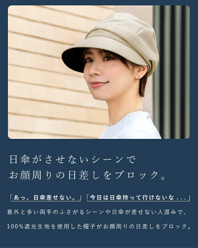 商品説明 つばが短めのキャスケット!芦屋ロサブラン大人気モデルの広つばキャスケットよりも、つば長さが少し短いタイプのキャスケットも欲しいとのお声で登場! すっぽりと深く被れるキャスケットなので、ちょっとしたお散歩・お買い物の際にすっぴんで出ても気にならない! つば裏には100%遮光生地を使用。汚れたり摩擦しても遮光率は落ちず生地が破れない限り遮光性能はキープします。頭頂部や頭周りの生地はUV(A波/B波)遮蔽率99%を達成し紫外線をシャットアウト! また、つば裏の黒い生地が地面や壁の照り返し光線から肌や目を守ります。 内側にサイズ調節テープが付いており、シーンにより被り心地を変えるのも可能。また、暑さを少しでも軽減すべく、裏地には制菌加工を施した接触冷感生地を使用しておりさらっとした涼しい肌触りとなっています。 商品情報 【接触冷感素材とは】 糸、編み、加工をバランスよくコントロール。コットンを物理的、化学的に改質することにより、高いレベルの涼感と着心地の良さを両立させた素材です。高い接触冷感値と独特のシャリ感で肌触りがさわやかな素材となっております。繰り返し洗濯をしても接触冷感機能を損なわず、これにて気になる蒸れを軽減します♪ 【制菌加工とは】 抗菌防臭加工が臭いに着目した加工であるのに対し、制菌加工は繊維上の皮膚常在菌や有害細菌を特定して、それらが増えないように抑制することを目的とした加工です。 【ご注意】 ※縫製品には必ず針穴があり、少なからず光が漏れる可能性がございますが、生地自体が遮光率100%の性能を持っているということから、芦屋ロサブランでは100%遮光とさせていただいております。 ※中性洗剤手洗い可能(長時間の浸け置きはお止め下さい)優しく手押し洗いをお願い致します。洗濯機・タンブラー乾燥・漂白剤・アイロンがけはお避け下さい。 ※色落ち/色移りの恐れがありますので単独で洗濯して下さい。 ※手洗い後は、形を整え風通しの良い場所で陰干しして下さい。 ※長時間丸めて/折って保管することはお控えください。 ※商品画像と実物には色の差がある場合がございます。ご了承の上ご購入ください。 ※風が強い場合は十分にお気を付け下さい。 ※あまり深く被り過ぎると視野が狭くなりますので、適度な深さでご使用ください。 ※初期不良の受付はご利用前に限ります。 ※ご利用前に品質ネームタグの記載をご確認下さい。 ※接触冷感の体感温度はご使用環境や個人差によって異なります。 【配送形態について】 こちらの商品はボックスに入れてのお届けとなります。 スペック 数量 1pcs(1個) サイズ 【Lサイズ】頭囲:約59cm〜約57.5cm 【Mサイズ】頭囲:約57.5cm〜約56cm 【Sサイズ】頭囲:約56cm〜約54cm つば長さ:約7.5cm 高さ:約16cm 素材 シャンブレーブラック [表地] 複合繊維(ポリエステル)100% [つば裏(遮光生地)] 生地本体:ポリエステル100% 生地加工部分:ポリウレタン100% [裏地(接触冷感生地)] (制菌加工 [剤名:無機系(酸化亜鉛)]) 綿100% ※体感温度はご使用環境や個人差によって異なります ダンガリーベージュ [表地] ポリエステル100% [つば裏(遮光生地)] 生地本体:ポリエステル100% 生地加工部分:ポリウレタン100% [裏地(接触冷感生地)] (制菌加工 [剤名:無機系(酸化亜鉛)]) 綿100% ※体感温度はご使用環境や個人差によって異なります 生産国 製造:中国 生地:日本 ギフトラッピング FAQ・お問合わせ 【ワード】 ギフト 贈り物 贈答品 記念品 お中元 お歳暮 お年賀 お誕生日 バースデープレゼント お祝い お返し 結婚内祝い 母の日 父の日 ホワイトデー 暑中見舞い クリスマス 敬老の日 成人祝い 就職祝い 結婚記念日 お礼 美容 光線 日光過敏症 遮熱 UVカット 軽量 涼しい 紫外線対策 ケアメールマガジンのご登録はこちら つば12cmタイプはこちら 総遮光タイプはこちら キャスケット一覧はこちら