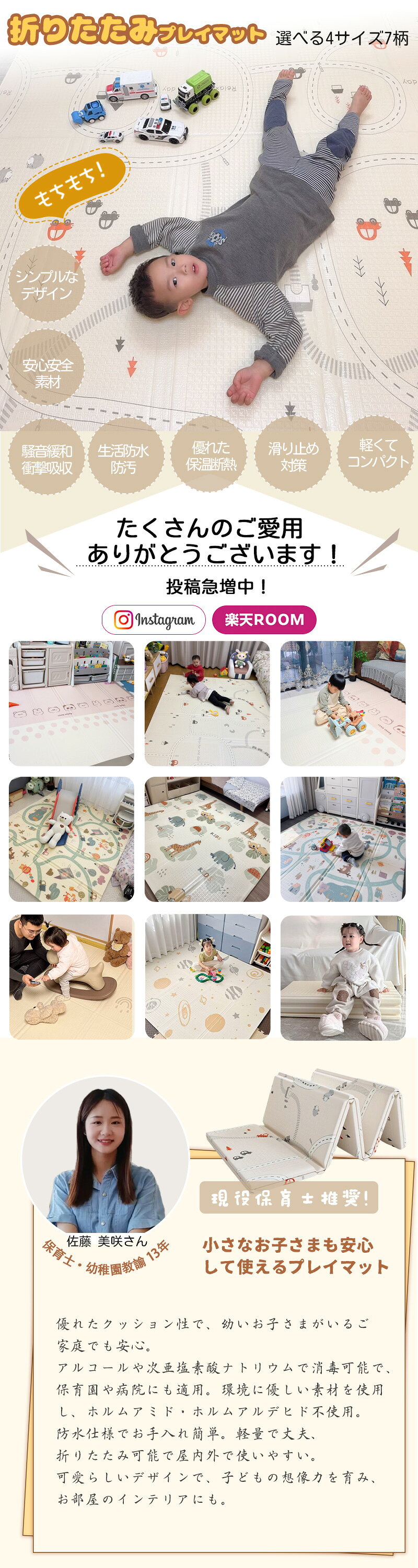 商品説明商品名【かわいい14柄 ギフト用手持ちバック】プレイマット 折りたたみ ベビー 両面仕様 道路 防水 赤ちゃん 抗菌 防汚 防音 ベビーマット 子供部屋 幼稚園 保育園 男の子 女の子 コンパクト 防音マット お昼寝マット クリスマス適 応サイズ開いた状態:200×180×2cm150×180×2cm200×180×1cm150×180×1cm折りたたんだ状態:90×40×20cm75×36×20cm90×40×10cm75×36×10cm重さ:1.7kg1.2kg1.0kg0.7kg素材XPEカラー「宇宙と星空」「夢の街とくま」「森の楽園とレール 」「虹とアニマル」「トレインと雪の仲間」「森の街とどうぶつ」「アニマルパーティー」お勧めポイント安心・安全設計で赤ちゃんにもぴったり!高品質XPE素材を採用し、ホルムアルデヒド・ホルムアミド不使用で無臭。顔をこすっても、なめても安心!現役保育士も推薦する、安全性重視のプレイマット。優れたクッション性と衝撃吸収力!厚さ2cmの最厚設計&30倍発泡構造で、転んでも痛くない!赤ちゃんのハイハイや寝返り、元気なキッズのジャンプにも対応。家具の騒音対策にも◎防水・防汚でお手入れ簡単♪表面は撥水コーティング+防水凹凸生地で、飲みこぼしや汚れもサッと拭くだけ。アルコール・次亜塩素酸ナトリウムでの消毒も可能で、清潔を保てます。軽量&折りたたみ式で持ち運び便利!3秒で折りたためて、省スペースに収納。軽くてコンパクト、ギフトバッグ付きで屋内外の持ち運びも楽々!ピクニックやヨガマットとしても活躍!おしゃれなリバーシブルデザイン♪子どもの感性を育む7種類の可愛い柄&両面仕様で気分に合わせて使い分け。お部屋のインテリアにも自然に馴染み、遊びながら学べる楽しいデザイン!お勧めポイントご使用上の注意★火気や高温になる場所(ストーブ・ヒーター付近など)での使用はお避けください。変形や劣化の原因となります。★直射日光が当たる場所、高温多湿の場所での長時間の使用・保管はご遠慮ください。★重たい家具などを長時間置くと、跡が残る場合があります。定期的に位置を変えることをおすすめします。★ペットの鋭い爪や歯によって、表面が傷つく場合があります。ご注意ください。★防水仕様ですが、水分や汚れを長時間放置すると、カビやシミの原因となる恐れがあります。すぐに拭き取ってください。★カレー、ラーメン、色移りしやすい飲料・果物・衣類などとの接触は色移りの恐れがありますのでご注意ください。★製造工程の都合上、表裏の柄や凹凸の仕様はランダムとなります。あらかじめご了承ください。★ご覧のモニター環境や照明により、実際の色味と異なって見える場合があります。サイズについて製造工程の特性上、マットのサイズには若干の個体差が生じる場合がございます。予めご了承ください。★長さ・幅:±2〜5cm程度★厚さ:±0.2〜0.5cm程度よく一緒に購入されている商品メーカー希望小売価格はメーカーサイトに基づいて掲載していますメーカー希望小売価格はメーカーサイトに基づいて掲載しています\今週の目玉セール!/人気アイテムがお得に買えるチャンス商品説明商品名【かわいい14柄 ギフト用手持ちバック】プレイマット 折りたたみ ベビー 両面仕様 道路 防水 赤ちゃん 抗菌 防汚 防音 ベビーマット 子供部屋 幼稚園 保育園 男の子 女の子 コンパクト 防音マット お昼寝マット クリスマス適 応サイズ開いた状態:200×180×2cm150×180×2cm200×180×1cm150×180×1cm折りたたんだ状態:90×40×20cm75×36×20cm90×40×10cm75×36×10cm重さ:1.7kg1.2kg1.0kg0.7kg素材XPEカラー「宇宙と星空」「夢の街とくま」「森の楽園とレール 」「虹とアニマル」「トレインと雪の仲間」「森の街とどうぶつ」「アニマルパーティー」お勧めポイント安心・安全設計で赤ちゃんにもぴったり!高品質XPE素材を採用し、ホルムアルデヒド・ホルムアミド不使用で無臭。顔をこすっても、なめても安心!現役保育士も推薦する、安全性重視のプレイマット。優れたクッション性と衝撃吸収力!厚さ2cmの最厚設計&30倍発泡構造で、転んでも痛くない!赤ちゃんのハイハイや寝返り、元気なキッズのジャンプにも対応。家具の騒音対策にも◎防水・防汚でお手入れ簡単♪表面は撥水コーティング+防水凹凸生地で、飲みこぼしや汚れもサッと拭くだけ。アルコール・次亜塩素酸ナトリウムでの消毒も可能で、清潔を保てます。軽量&折りたたみ式で持ち運び便利!3秒で折りたためて、省スペースに収納。軽くてコンパクト、ギフトバッグ付きで屋内外の持ち運びも楽々!ピクニックやヨガマットとしても活躍!おしゃれなリバーシブルデザイン♪子どもの感性を育む7種類の可愛い柄&両面仕様で気分に合わせて使い分け。お部屋のインテリアにも自然に馴染み、遊びながら学べる楽しいデザイン!お勧めポイントご使用上の注意★火気や高温になる場所(ストーブ・ヒーター付近など)での使用はお避けください。変形や劣化の原因となります。★直射日光が当たる場所、高温多湿の場所での長時間の使用・保管はご遠慮ください。★重たい家具などを長時間置くと、跡