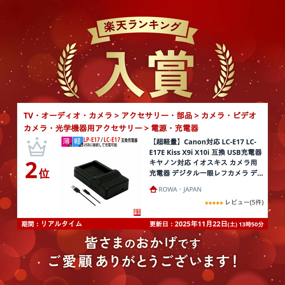 【超軽量】Canon対応 LC-E17 LC-E17E Kiss X9i X10i 互換 USB充電器 キヤノン対応 イオスキス カメラ用充電器 デジタル一眼レフカメラ デジカメ デジタルカメラ LP-E17 ロワジャパン [ランキング受賞]