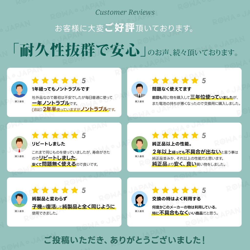 最近、子機の充電すぐなくなりませんか? ロワの互換バッテリーで電池問題スッキリ解決! 【容量アップ1.23倍】x【販売数24万個突破】x【評価数338件突破】 楽天ランキング上位常連!レビュー★高評価&リピーター続出! 商品の詳細 対応メーカー名 パナソニック対応 保証期間 お買い上げ日より3ヶ月間 電池 Ni-MH 使用セル CHINA 電圧 2.4V 容量 800mAh(純正に比べ150mAh容量アップ!) 商品説明 ■互換型番 ◆PANASONIC対応 パナソニック対応 KX-FAN55、BK-T409 ◆NTT対応 CT-デンチパック-108、CT-電池パック-108 ◆ELPA対応 エルパ対応 朝日電器対応 TSA-125、TSC-125 TSB-125、THB-125 ◆OHM対応 オーム電機対応 TEL-B38、TEL-B88 TEL-B0018H、TEL-B0068H、TEL-B2029H 対応機種 ■対応機種 ◆PANASONIC対応 パナソニック対応 【増設子機】 KX-FKD401、KX-FKD401-W、KX-FKD402、KX-FKD402-P KX-FKD402-T、KX-FKD402-Z、KX-FKD403、KX-FKD403-W KX-FKD502、KX-FKD502-S、KX-FKD503、KX-FKD503-W KX-FKD602、KX-FKD602-W、KX-FKD603、KX-FKD603-W 【デジタルコードレスファクス】 KX-PD301DL、KX-PD301DL-K、KX-PD301DL-W、KX-PD301DW KX-PD301DW-K、KX-PD301DW-W、KX-PD303DL、KX-PD303DL-K KX-PD303DL-W、KX-PD303DW、KX-PD303DW-K、KX-PD303DW-W KX-PD502DL、KX-PD502DL-T、KX-PD502DL-W、KX-PD502DW KX-PD502DW-T、KX-PD502DW-W、KX-PD502UD、KX-PD503UD KX-PD503UW、KX-PD551D、KX-PD551D-S、KX-PD551DL KX-PD551DL-S、KX-PD601DL、KX-PD601DL-N、KX-PD601DL-W KX-PD601DW、KX-PD601DW-N、KX-PD601DW-W、KX-PD603D KX-PD603D-W、KX-PD603DL、KX-PD603DL-N、KX-PD603DL-W KX-PD603D-N、KX-PD603DW、KX-PD603DW-N、KX-PD603DW-W KX-PD604SL、KX-PD701DL、KX-PD701DL-S、KX-PD701DW KX-PD701DW-S、KX-PD702DL、KX-PD702DW、KX-PD703SL KX-PD703SW、KX-PD703UD、KX-PD703UW、KX-PZ628DLE KX-PZ628DWE 【デジタルコードレス電話機】 VE-GD21DL、VE-GD21DL-W、VE-GD21DW、VE-GD21DW-W VE-GD23DL、VE-GD23DW、VE-GD31DL、VE-GD31DL-P VE-GD31DL-W、VE-GD31DW、VE-GD31DW-P、VE-GD31DW-W VE-GD51D、VE-GD51D-K、VE-GD51D-S、VE-GD51DL VE-GD51DL-K、VE-GD51DL-S、VE-GD51DW、VE-GD51DW-S VE-GD53D、VE-GD53D-N、VE-GD53D-W、VE-GD53DL VE-GD53DL-N、VE-GD53DL-W、VE-GD53DW、VE-GD53DW-N VE-GD71DL、VE-GD71DL-S、VE-GD71DW、VE-GD71DW-S VE-GDS01、VE-GDS01DL、VE-GDS01DL-K、VE-GDS01DL-P VE-GDS01DL-T 【テレビドアホン】 VL-SVD300KL、VL-SVD301KL、VL-SVD302KL、VL-SVD303KL VL-SVD501KL、VL-SVD501KS、VL-SVD505KF、VL-SVD505KS VL-SWD200K、VL-SWD210K、VL-SWD220K、VL-SWD300KL VL-SWD301KL、VL-SWD302KL、VL-SWD303KL、VL-SWD501KL VL-SWD501KS、VL-SWD505KF、VL-SWD505KS、VL-SWD700KL 【ワイヤレスモニター子機】 VL-WD608、VL-WD609、VL-WD611、VL-WD612 VL-WD613、VL-WD618 【ホームスマートフォン】 VS-HSP200S ◆NTT対応 【コードレス電話機】 DCP-5700P、DCP-5700PW 1.9Gデジタルコードレス電話機「P1」 【ワイヤレスモニタ】 1.9Gワイヤレスモニタ-PV 1.9Gワイヤレスモニタ-P5 【ファックス】 でんえもん722PD、でんえもん722PDW、でんえもんP-722PD P-722PD、P-722PDw、NTTFAX P-722PD、NTTFAX P-722PDw ■数量:2個セット ■サイズ:21.9 x 50.4 x 11.7mm ■純正品ではございません