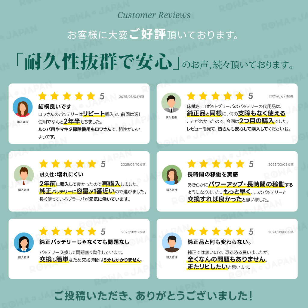 掃除の途中で止まること、増えていませんか? リピート購入が信頼の証!長持ちバッテリーで快適なお掃除を 【1年保証】\累計販売数65,000個突破/\レビュー741件突破/ ブラーバに最適な実容量2200mAh!レビュー★高評価&リピート続出! 商品の詳細 対応メーカー名 アイロボット対応 保証期間 お買い上げ日より1年間 電池 Ni-MH 使用セル CHINA 電圧 7.2V 容量 【実容量高】2200mAh (純正より200mAh容量アップ) 【 掃除機 にベストな容量!! 】 互換型番 ■互換型番 ◆irobot対応 アイロボット対応 4449273 4409709 4637207 11003067-00 GPRHC202N026 W206001001399 対応機種 ■対応機種 ◆irobot対応 アイロボット対応 Braava 300 series / ブラーバ300シリーズ Braava 371j / ブラーバ371j Braava 375 / ブラーバ375 Braava 375t / ブラーバ375t Braava 380 / ブラーバ380 Braava 380j / ブラーバ380j Braava 380t / ブラーバ380t Braava 381 / ブラーバ381 Braava 381j / ブラーバ381j Braava 390j / ブラーバ390j Braava 390t / ブラーバ390t Mint Plus 5200 / ミントプラス5200 Mint Plus 5200B / ミントプラス5200B Mint Plus 5200C / ミントプラス5200C B390060、B390045、B380065 B380020、B371060、B371070 B381060 ■純正品ではございません ※容量3600mAhと偽装表示された商品にご注意ください。 注意事項 ※初めてご使用になる前に、必ず充電を行ってください。 充電が完了しましたら、通常どおりご使用いただけます。 ※バッテリーの容量が少なくなるとランプが点滅します。 残量が空になる前に充電してください。 ※バッテリーを使用せずに長期間放置すると、内部の素材が劣化する場合があります。 使用しない場合も定期的に充電し、満充電の状態で冷暗所に保存してください。 劣化防止のため、買い置きはお控えください。