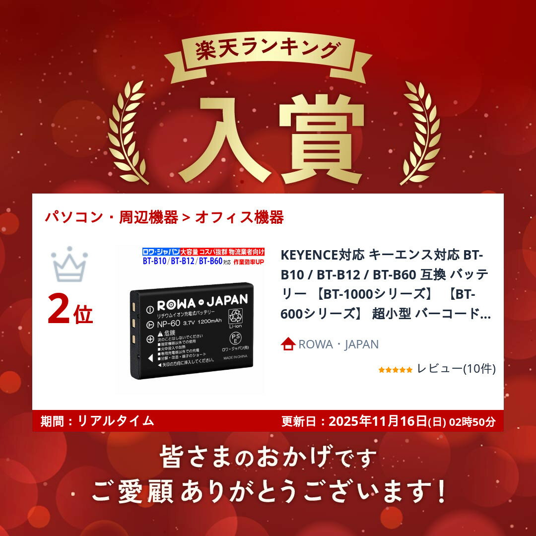 商品の詳細 対応メーカー名 KEYENCE対応 保証期間 お買い上げ日より3ヶ月間 保護回路 過充電、過放電、過電流などの保護回路が内蔵 使用セル CHINA 電圧 3.7V 容量 1200mAh(純正より100mAh容量アップ) 商品説明 ■対応機種 ◆KEYENCE対応 / キーエンス対応 【BT-1000 シリーズ】 BT-1000B BT-1000W BT-1010 BT-1010B BT-1010W BT-1010WB BT-1010WBG BT-1010WBGM BT-1010WBGW BT-1500B BT-1550 BT-1550WB BT-1550WBG BT-1550WBGM BT-1550WBGW 【BT-600シリーズ】 BT-600 BT-600B ■互換型番 ◆KEYENCE対応 / キーエンス対応 BT-B10 BT-B10B BT-LIBS BT-B12 BT-B12B BT-B60 ■外形寸法:縦35.3mm×横53.0mm×厚さ7.1mm ■純正品ではございません。 ■PSマークの種類:PSE ■届出事業者名:ロワ・ジャパン有限会社