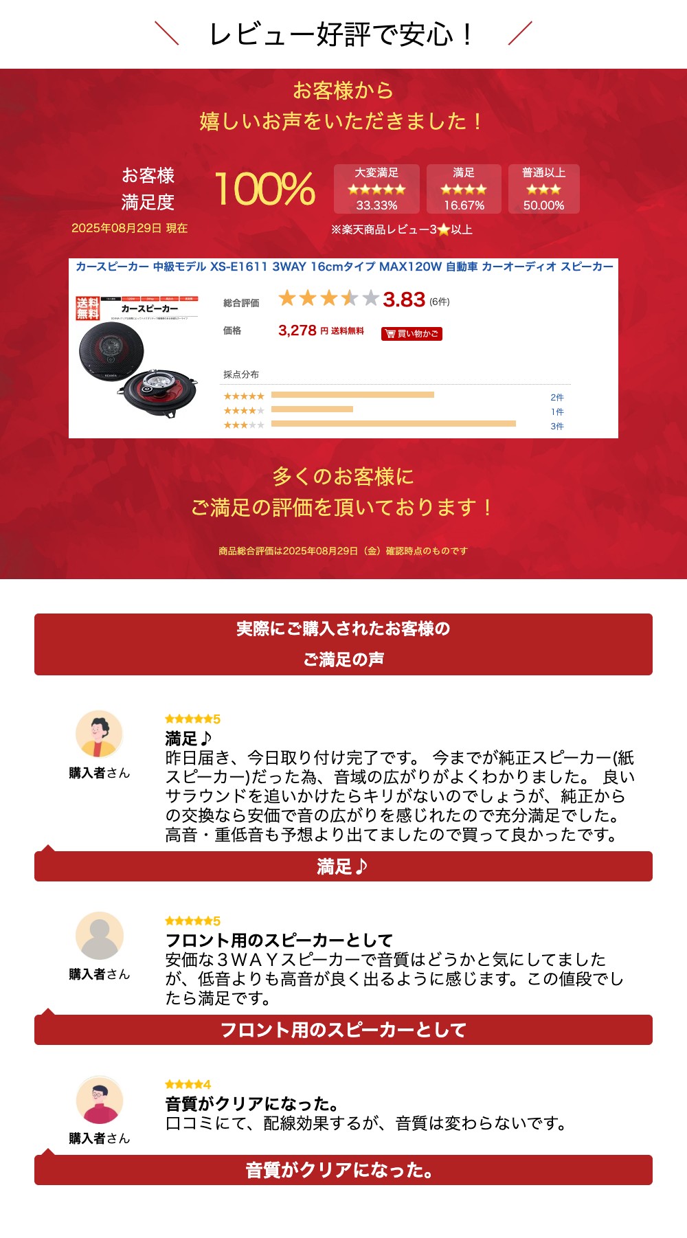 クリアな音質を ハイクオリティ&臨場感のある音質でカーライフを快適に 配線も簡単ですぐにお使いいただくことができます。 商品内容:3WAY MAX120W カースピーカー 16cm 品番:XS-E1611 本体サイズ:φ16cm 奥行き5cm グリルカバーサイズ:φ16.5cm 厚さ1.7cm MaxPower120W:4Ω [参考対応タイプ/機種/車種] カースピーカー カースピーカ カーオーディオ ツイーター ハイクオリティー スピーカー ウーハー ウーファー サブウーファー関連商品カースピーカー 上級モデル TS-A1647S 2WAY 16cmタイ...カースピーカー 基本モデル PL-1648 3WAY 16cmタイプ ...カースピーカー 中級モデル XS-E1411 2WAY 10cmタイプ...3,278円3,278円2,508円カースピーカー 上級モデル TS-G6941R 6×9inch 6×9...カースピーカー 上級モデル TS-A1047S 2WAY 10cmタイ...カースピーカー 基本モデル PL-1048 2WAY 10cmタイプ ...4,158円2,508円2,508円カースピーカー 中級モデル XS-E1511 3WAY 13cmタイプ...カースピーカー 上級モデル TS-A1347S 2WAY 13cmタイ...バックカメラ リアカメラ 変換ケーブル セット RCH001T 互換 ...2,948円2,948円3,058円バックカメラ リアカメラ 変換ケーブル セット RD-C100 互換 ...カースピーカー 基本モデル PL-1348 2WAY 13cmタイプ ...オイルフィルター オイルエレメント 社外品 スズキ トヨタ ダイハツ ...3,058円2,948円3,168円仕様 商品 カースピーカー 16cm型 内容個数 2個(左右各1個) タイプ デュアルコーン 構成 160mmインジェクテッドP.P.コーンウーファー パワフルバス搭載ウーファー ツィーター 出力 最大120W・標準40W 音圧 91dB インピーダンス 4Ω 再生周波数 30〜30000Hz 付属品 スピーカーケーブル ※外箱記載の金属パーツ・ビスは付属していません。 注意事項 適合車種のお問い合わせには一切お答え致しかねます。 取扱説明書は付属しておりません。 取付や使用方法に関するサポートは一切できません。 商品違いなどによるお客様都合の返品や返金は対応致しかねます。 ご使用上の不備による事故については一切責任を負いかねます。 輸入品のため、商品や外箱に細かなキズや汚れがある場合がございます。 知識のない方は専門業者に依頼してください。 生産時期によって仕様・デザインが多少異なる場合がございます。 商品に不具合が生じた場合でも取付料や工賃などの補償は対象外です。 車検対応の可否についてはお答え致しかねます。