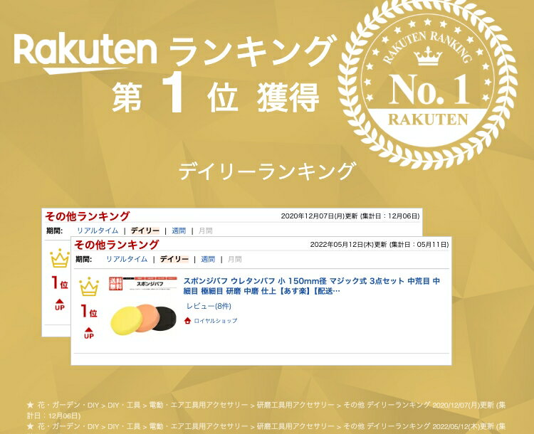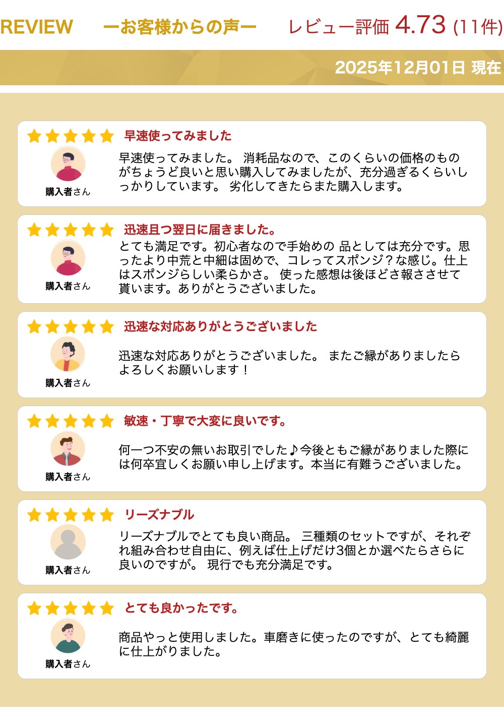 スポンジバフ ウレタンバフ ウレタンスポンジバフ ポリッシャー 研磨 から 最終仕上げ まで 【仕様】 外径:150mm 厚み:30mm マジックパッド:120〜150mmに対応 【セット内容】 黄色 研磨用:中荒目(荒目) 橙色 中磨き用:中細目(細目) 黒色 仕上げ用:極細目 ※ご使用方法についてはサポートしておりません。 ※ご使用上の不備による事故については一切責任を負いかねます。関連商品ビルジポンプ 12V 小型 水中ポンプ ビルジ排水 ハッチ給排水 養魚...ビルジポンプ 24V 小型 水中ポンプ ビルジ排水 ハッチ給排水 養魚...ダブルフレアリングツールキット エアコン工具...3,498円3,498円2,838円マイクスタンド マイクホルダー ブーム付 伸縮角度自由自在...カースピーカー 基本モデル PL-1048 2WAY 10cmタイプ ...カースピーカー 中級モデル XS-E1411 2WAY 10cmタイプ...2,288円2,508円2,508円カースピーカー 上級モデル TS-A1047S 2WAY 10cmタイ...メジャー テープメジャー 巻き尺 巻尺 100m...オイルチェンジャー 手動 9L 大容量タンク オイル交換...2,508円2,398円6,138円カーフィルム カット済み リアセット ジムニー JA11V JA12V...カーフィルム カット済み リアセット エスティマ ACR50W ACR...カーフィルム カット済み リアセット エブリイ エブリー エブリィ バ...2,780円2,780円2,780円仕様 商品 スポンジバフ 外径 150mm 厚み 30mm マジックパッド 120〜150mmに対応 セット内容 黄色 研磨用:中荒目(荒目) 橙色 中磨き用:中細目(細目) 黒色 仕上げ用:極細目 注意事項 取扱説明書は付属しておりません。 取付や使用方法に関するサポートは一切できません。 商品違いなどによるお客様都合の返品や返金は対応致しかねます。 ご使用上の不備による事故については一切責任を負いかねます。 輸入品のため、商品や外箱に細かなキズや汚れがある場合がございます。 知識のない方は専門業者に依頼してください。 生産時期によって仕様・デザインが多少異なる場合がございます。 [参考対応タイプ/機種/車種] セダン スポーツ SUV クロスカントリー ステーションワゴン ミニバン コンパクトカー 2BOX トールワゴン 商用車 軽自動車 乗用車 トヨタ TOYOTA ニッサン 日産 NISSAN ホンダ HONDA 三菱 MITSUBISHI マツダ MAZDA スバル SUBARU いすゞ いすず ISUZU スズキ SUZUKI ダイハツ DAIHATSU ディーラー 新車 中古車 メーカー製 社外製 社外品 純正 117クーペ AD MAX AD エキスパート AZ ワゴン AZ-1 AZ-3 Be-1 CR-X デルソル CR-Z D5 eKクラッシィ GTO HR-V iQ MR2 MR-S MRスパイダー MRワゴン MS-6 MS-8 MS-9 N360 NSX PA ネロ R1 R2 RVR RX-7 RX-8 S2000 SMX SX4 TN360 WiLL Vi WiLL VS WiLL サイファ X-90 YRV アウトバック アウトランダー アクシオ アクセラ アクティ アクティ ストリート アクティ トラック アコード クーペ アコード ワゴン アスカ アスコット アスコット イノーバ アスパイア アテンザ スポーツ アトラス アトレー バン アトレー ワゴン アバロン アプローズ アベニール サリュー アベンシス アベンシス ワゴン アリスト アルシオーネ SVX アルティス アルテッツァ アルテッツァジータ アルト アルファード ハイブリット アレックス イスト インスパイア インテグラ SJ インフィニティ Q45 インプレッサ WRX インプレッサ アネシス ヴィヴィオ ウィザード ウィッシュ ヴィッツ ウイングロード ウィンダム ヴォクシー ヴォルツ エアウェイブ エアロバス エクサ エクストレイル エクリプス エスカルゴ エスクード エスティマ ハイブリッド エテルナ エブリィ プラス エメロード エリオ セダン エリシオン エルフ エレメント オースター オーパ オーリス オデッセイ オプティ オリジン ガゼール カプチーノ カペラ カーゴ カムリ グラシア ワゴン カムロード カリーナ バン カリーナED カルタス クレセント カルディナ カレン カローラ II キザシ キックス キャパ キャミ キャラバン バス ギャラン フォルティス キャリイ トラック キャンター ガッツ キューブ キュービック クイックデリバリー クー クーペ クオリス クラウン エステート グランビア クリッパー バン クルー クルーガーハイブリッド グレート クレスタ クレフ クロスオーバー クロスロード クロノス グロリア ワゴン コースター コスモ コペン コモ コルサ コルト プラス コロナ エクシヴ コンチェルト コンドル コンフォート サイノス サクシード バン サクシード ワゴン サニー カリフォルニア サンタナ サンバー トラック ジープ シーマ ジェミニ ジェミネットII シエロ シティ シビック GX シビリアン ジムニー シエラ ジャーニー ジャズ シャトル シャリオ シャリオ グランディス シャレード ジューク ジュニア スイフト スイフトスポーツ スーパーグレート スープラ スカイライン GTR GT-R スクラム ワゴン スターレット スタンザ ステージア ステップワゴン ステラ ストーリア ストラーダ ストリーム スパーキー スパシオ スピアーノ スプラッシュ スプリンター カリブ スペースギア スポーツワゴン ゼスト スパーク セダン セドリック ワゴン セフィーロ ワゴン セプター セラ セリカ XX セルボ セレナ カーゴ セン