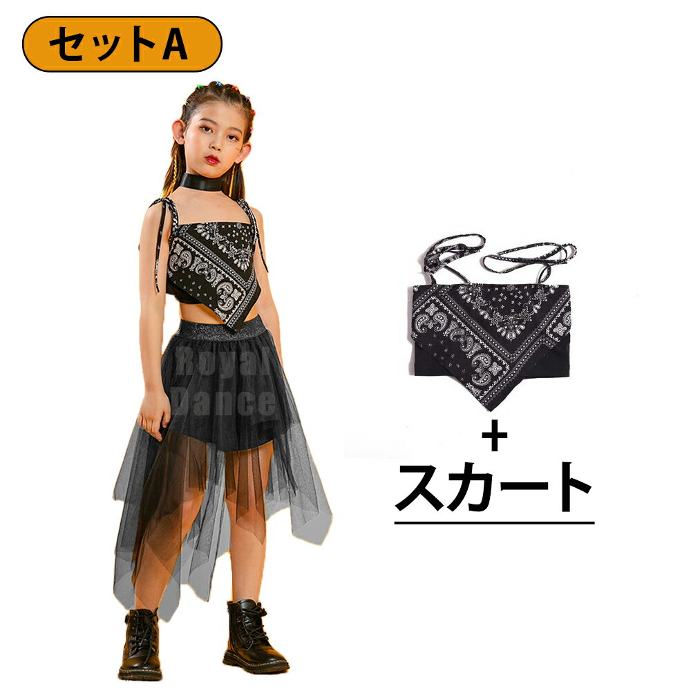 全品5%OFFクーポン! キッズダンス衣装 セットアップ ブラック 黒 ペイズリー ヘソ出し トップス スカート パンツ kpop 韓国 ボトムス クロップトップ フレア キッズ ダンス 衣装 女の子