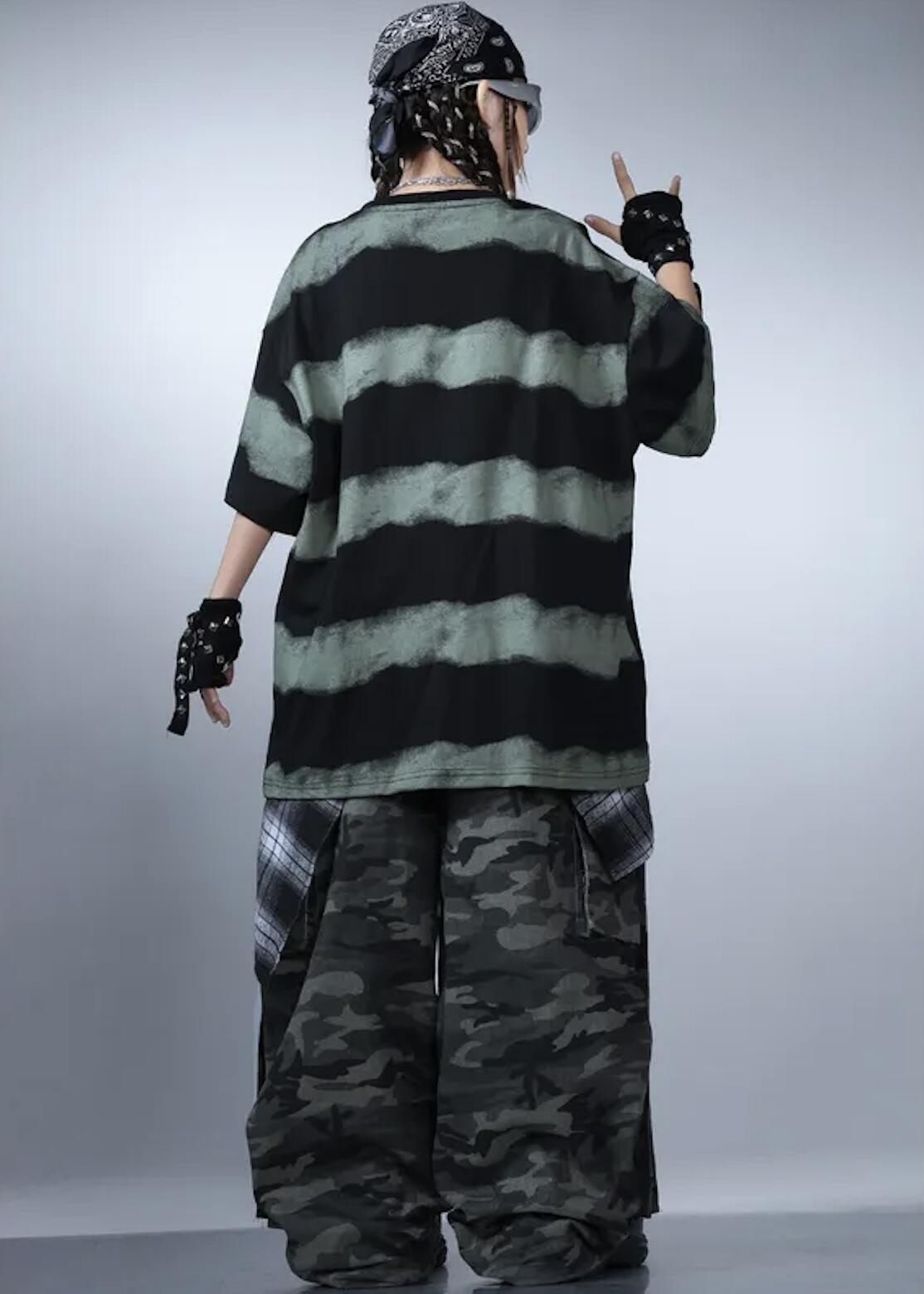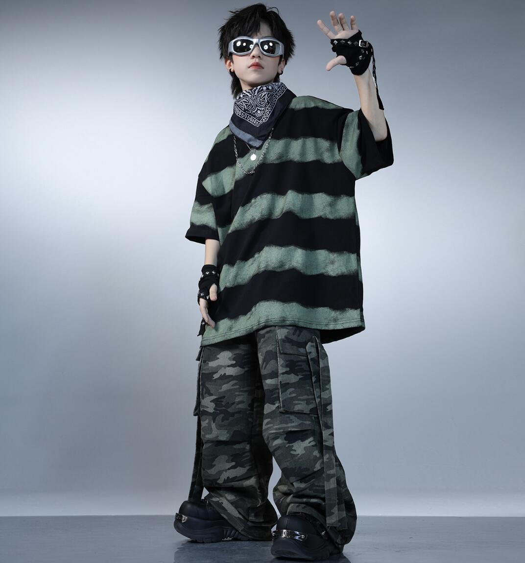 よりどり2点購入で5%OFFクーポン! ダンス衣装 キッズ ボーダー 半袖 tシャツ トップス 迷彩 カーゴパンツ ヒップホップ ステージ衣装 hiphop kpop 韓国 子供 キッズ ダンス衣装 女の子 男の子