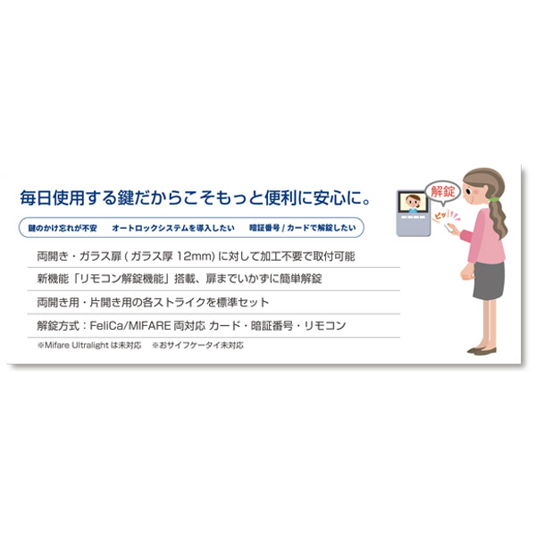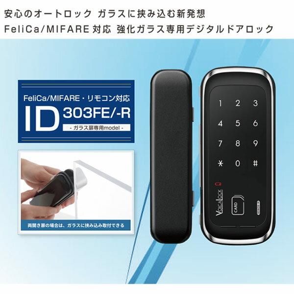 LOCKMAN ロックマン 強化ガラス専用 デジタルドアロック ID-303FE-R 鍵を「安心」「安全」「便利」に。毎日使用する鍵だからこそもっと便利に安心に。 コストパフォーマンスに優れた、電池式電子錠によるオートロックシステム リモコン1個付きになります。リモコンは最大5個登録可能です。 受信機は内側ボディに装着してあります。 リモコンのみはこちらからご購入できます。 ・安心のオートロック機能・簡単操作 ・セキュリティの強化・鍵の管理を簡単・便利に ■特徴 ・扉を閉めると自動でロック、オートロック機能搭載 ・強化ガラス扉(ガラス厚12mm)に対して加工不要の簡単設置br> ・新機能「リモコン解錠機能」搭載、扉までいかずに簡単解錠 ・両開き用・片開き用の各ストライクを標準セット ・解錠方式:リモコン・暗証番号・カード(FeliCa/MIFARE) ガラス厚:12mm 外観、切欠図は画像にてご確認ください。 ※リンク先は『決済・返品・交換』ページになります。