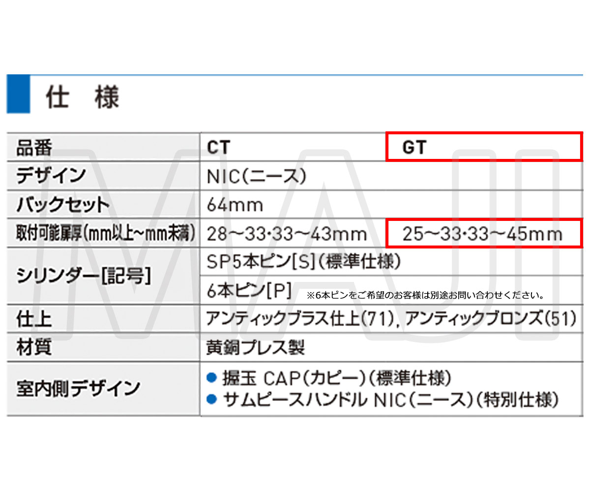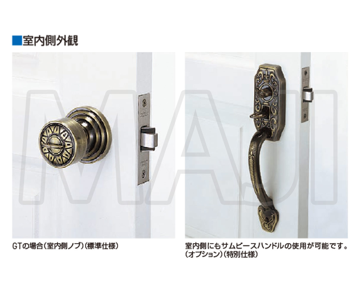 GOAL G・F アンティック錠 S-GT-5 NIC71/51 付属キー 3本 シリンダータイプ SP5本ピン※6本ピンをご希望のお客様は別途お問い合わせください。 デザイン NIC(ニース) バックセット(BS) 64ミリ(錠前フロント板からシリンダーセンターまでのサイズ) 対応扉厚 25ミリ以上〜33ミリ未満、33ミリ以上〜45ミリ未満 色 アンティックブラス仕上(71)、アンティックブロンズ(51)※メイン画像はアンティックブラス仕上(71)になります。 納期 ノブタイプ:少量在庫品になります。ハンドルタイプ:実動20〜30日前後(土日祝日含まない)かかります。在庫切れ等で納期がかかる場合、ご注文後、メールにて納期のご連絡をしております。お急ぎのお客様は前もって納期をご確認ください。 操作性、デザイン性に優れたサムピースハンドル錠。錠本体はコンパクトなインテグラル錠UC,Gを使用。 フロント刻印は「GOAL G・F」になります。ご確認ください。 こちらの商品は品番が「GT」になります。仕様画像にてご確認ください。 品番「CT」をご希望の場合はこちらからご購入いただけます。 室内側デザインをノブタイプまたはハンドルタイプからお選びいただけます。下記画像にてご確認ください。 外観図は下記画像にてご確認ください。 ※色合いは実物と若干異なる場合がございます、ご了承ください。大きさは全て約寸法です。 ※リンク先は『決済・返品・交換』ページになります。
