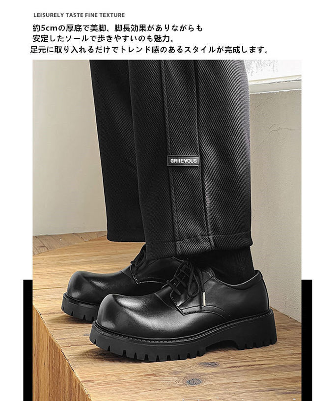 商品詳細 ■カラー展開: ブラック(インナーソールなし) ブラック(インナーソール付き) ■ソール:約5cm ※インナーソール付きのタイプ:インナーソール約1.5cm ■サイズ展開:24.0 24.5 25.0 25.5 26.0 26.5 27.0 27.5 28.0 ■素材 アッパー:合成皮革 ソール:ゴム ■関連ワード:ブーツ メンズ 靴 くつ 厚底 厚底ラバーソールシューズ レザーシューズ レースアップシューズ ドレスシューズ ビジネスシューズ ビジネス 革靴 厚底レースアップシューズ チャッカブーツ デザートブーツ ドレスシューズ カジュアル レザー タウンユース 二次会 旅行 おしゃれ ストラット レースアップ ローカット PUレザー 合成皮革 合皮 フェイクレザー シンプル 大人 ブラック 黒 カジュアル きれいめ フォーマル モード ヴィジュアル系 ビジュアル系 V系 パンク ロック タンクソール フォーマル モード 韓国 韓国系 韓国ファッション ストリート ストリートファッション ストリート系24.0 24.5 25.0 25.5 26.0 26.5 27.0 27.5 28.0 東京 プレゼント 贈り物 ギフト 男性 メンズファッション ■商品説明 PUレザー厚底レースアップローカットブーツが入荷しました。 程よい光沢のある上質なPUレザーを採用したレースアップブーツ。 自然な撥水性がありお手入れしやすく、耐久性にも優れているのでデイリーユースに適した素材です。 5cmの厚底で美脚、脚長効果がありながらも安定したソールで歩きやすいのも魅力。 足元に取り入れるだけでトレンド感のあるスタイルが完成します。 ミニマルなデザインで合わせやすく、カジュアルからフォーマルまで幅広いコーディネートに使える1足。 またクッション性の高いインソールを採用しているので歩き疲れにくく、タウンユースに最適。 ベーシックなデザインでコーディネートを問わず、オールシーズン履けるオススメの一足です。 ※モデル画像は照明などの影響により実際の商品と異なる場合がございます。 ※備考 ・靴の試し履きは必ず室内でお願いします。一度ご使用になられた靴の返品、交換はご遠慮ください。 ・掲載画像につきましては、撮影環境【室内・野外・天候】等、お客様の閲覧されますパソコンや携帯電話キャリアによって、実際の商品とは多少異なったお色に見える場合も御座いますので予めご了承下さいませ。 ・生産ロットによっての生地の色味や濃淡・質感が異なる場合がございます。 ・商品のほとんどは海外輸入品のため、日本製に比べて縫製等がしっかりしていない物もございます。 弊社では倉庫で検品は実施しておりますが、多少の糸のほつれ・糸の飛び出し・インク写り・小さな汚れ等ある場合もございますので、予めご了承下さいませ。 ・何か質問がございましたら、お気軽にメールにてご連絡ください。
