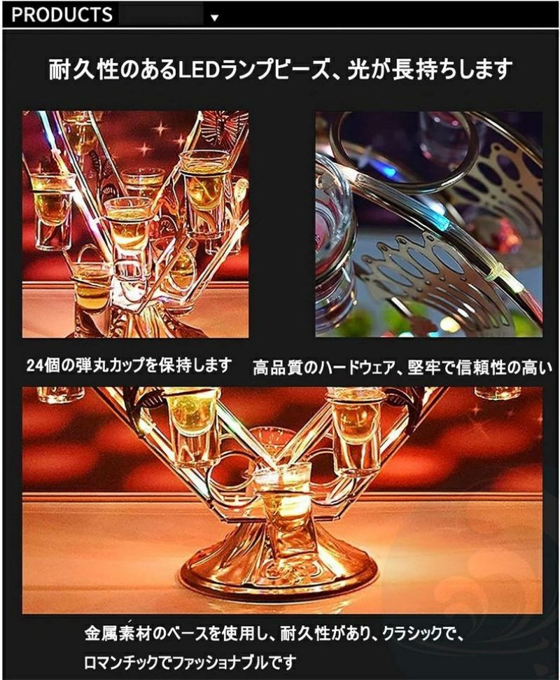 【雰囲気を強調表示】LED酒グラスの表示棚は独特なハートカッのデザイン七色のライトがとてもおしゃれくって綺麗。 このようなデザインは非常に注目されています。【LED輝く光のデザイン】ランプビーズはLED省エネランプビーズ製、カラフルな照明効果を放つだけでなく、グラス綺麗に見えます。お店使うどセンスアップ、パーティでは注目を集めています。【適用場所】LED観覧車酒棚はカラオケ、居酒屋、 バイ、クラブ、パーティー、飲み会ゲーム、自宅飲み、クリスマスなどに最適。自立型卓上ショットグラス収納できます、綺麗くって雰囲気満々です。【ご注意】この酒棚はアクリル素材+金属ベースです。アクリル素材硬くて長持ち金属ベース割りにくい。発泡スチロールされているので、破損の心配はありません。