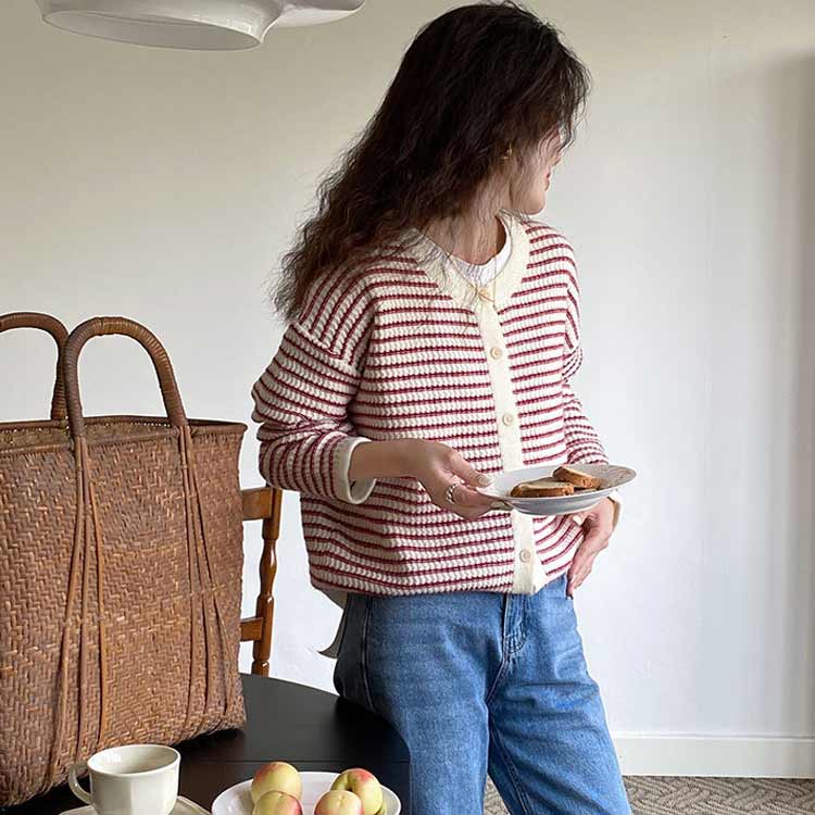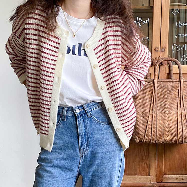 カーディガン レディース ボタン ボーダー ニットカーディガン クールネック カーデ ライトアウター 羽織り 前開き 長袖 ゆったり 通勤 通学 カジュアル 春秋 可愛い お洒落 送料無料