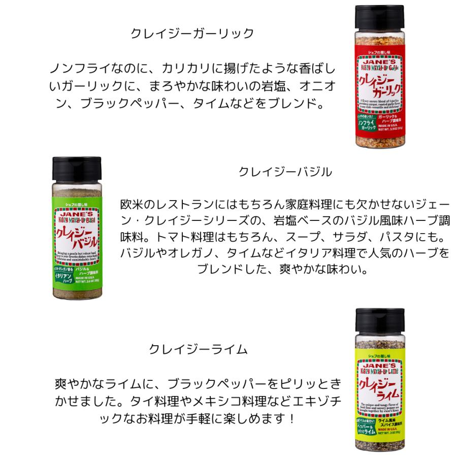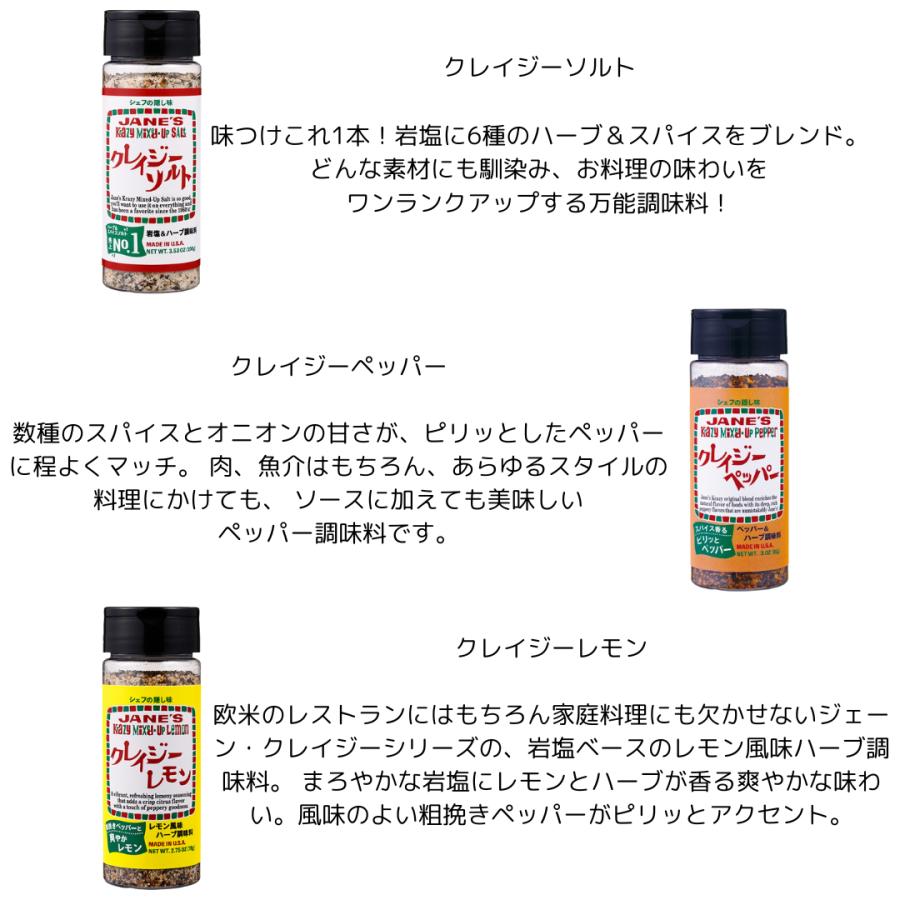 味付けこれ1本!岩塩に6種のハーブ&スパイスをブレンドした万能調味料【クレイジーソルト】 どんな素材にも馴染み、お料理の味わいをワンランクアップさせる、超ロングセラーです! 【JANE'S】(ジェーン) シーズニングソルトの代名詞! 欧米のレストランにはもちろん、 家庭料理にも欠かせない岩塩とハーブのスパイス調味料。 岩塩ならではの旨味とハーブを絶妙にブレンドしたクレイジーソルトは、 どんなお料理にもひと振りでたちまち 一流シェフの味に変えてしまう万能調味料です。 肉料理、魚料理、卵料理、サラダのほか、 バーベキューなどのアウトドアクッキングでも大活躍! ■原材料:岩塩、オニオン、ブラックペッパー、ガーリック、セロリシード、タイム、オレガノ ■原産国:アメリカ合衆国 ■保存方法:直射日光、高温多湿を避けて保存。開封後は要冷蔵。 販売元 日本緑茶センター株式会社 クレイジーソルト 内容量 100g 原材料名 岩塩、オニオン、ブラックペッパー、ガーリック、セロリシード、タイム、オレガノ クレイジーペッパー 内容量 85g 原材料名 ブラックペッパー、ブラックキャラウェイ、ブドウ糖、砂糖、ディルシード、コリアンダーシード、オニオン、グリーンパプリカ、レッドパプリカ、キャノーラ油/パプリカ色素 クレイジーレモン 内容量 78g 原材料名 岩塩、ブラックペッパー、ブドウ糖、砂糖、ガーリック、オニオン、オレンジピールパウダー、レモンピールパウダー/クエン酸、リン酸Ca クレイジーガーリック 内容量 111g 原材料 ガーリック、岩塩、オニオン、ブラックペッパー、セロリシード、キャノーラ油、タイム、オレガノ クレイジーバジル 内容量 102g 原材料名 岩塩、ガーリック、バジル、ブラックペッパー、コーンスターチ、パセリ、オニオン、オレガノ、タイム、キャノーラ油 クレイジーライム 内容量 85g 原材料名 ブラックペッパー、岩塩、ライム加工品(マルトデキストリン、砂糖、濃縮ライム果汁)/クエン酸、リン酸Ca、香料、レシチン、増粘剤(アラビアガム)、微粒二酸化ケイ素