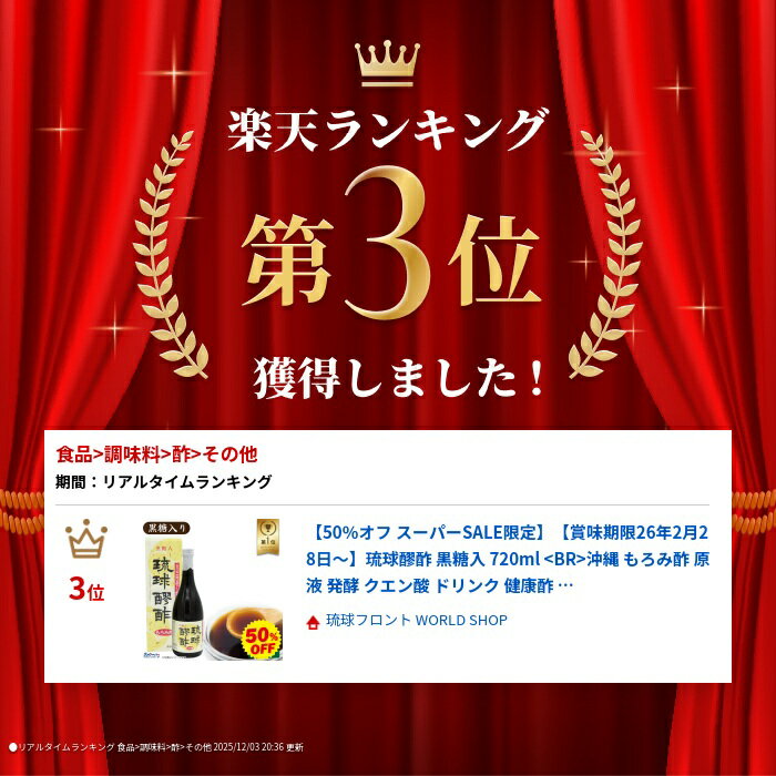 お買い上げ明細書と領収書について【商品説明】琉球から伝わる伝統の発酵飲料 琉球醪酢は、長寿の島沖縄の地酒「泡盛」の元もろみを用いて作った発酵クエン酸飲料です。 黒麹が生成するクエン酸と18種のアミノ酸が含まれます。 商品情報商品名瑞穂酒造 琉球醪酢 黒糖入りもろみ酢 720ml原材料米麹(沖縄県製造)、粗糖、黒糖商品の仕様・開栓前は品質保持のため直射日光・高温多湿を避け保存してください。 ・保存料は、一切使用しておりませんので開栓後は必ず冷蔵庫で保管しなるべく早めにお召し上がりください。 ・開栓時にネジ切り部分で手を切らないように十分注意してください。 ・飲用時に万一以上を感じた場合はお止めください。 ・もろみ酢と黒糖の成分が沈殿物となって生じますが、品質には問題ありませんので、よく振ってお飲みください。【こんな方にオススメ!】お父さん 父 母 お母さん 兄弟 姉妹 おばあちゃん おじいちゃん奥さん 彼女 旦那さん 彼氏 友人 先輩 後輩 上司 部下義母 義父 彼ママ 大人 先生10代 20代 30代 40代 50代 60代【 数量違い・送料無料・関連商品はこちら】 琉球醪酢 黒糖入りもろみ酢/ 【 数量違い・送料無料・関連商品はこちら】 琉球醪酢 黒糖入りもろみ酢/ 【 あわせ買いにおすすめ! 】