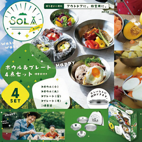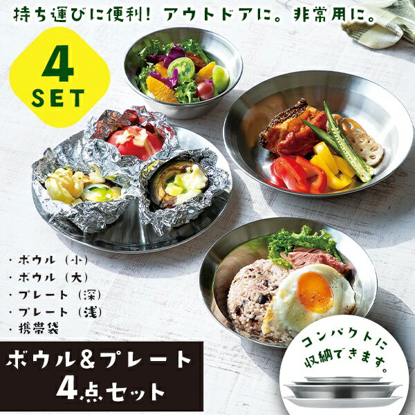 【お得クーポン配布中!】送料無料 ! アウトドア食器 4種類セット ステンレス製 ボウル&プレート 重ねて収納 携帯袋付き【 金属製 キャンピング お皿 深皿 浅皿 コンパクト 軽量 丈夫 キャンプ 釣り 飯 1人用 】 送料込 60N◇ ソラリラ4点セット