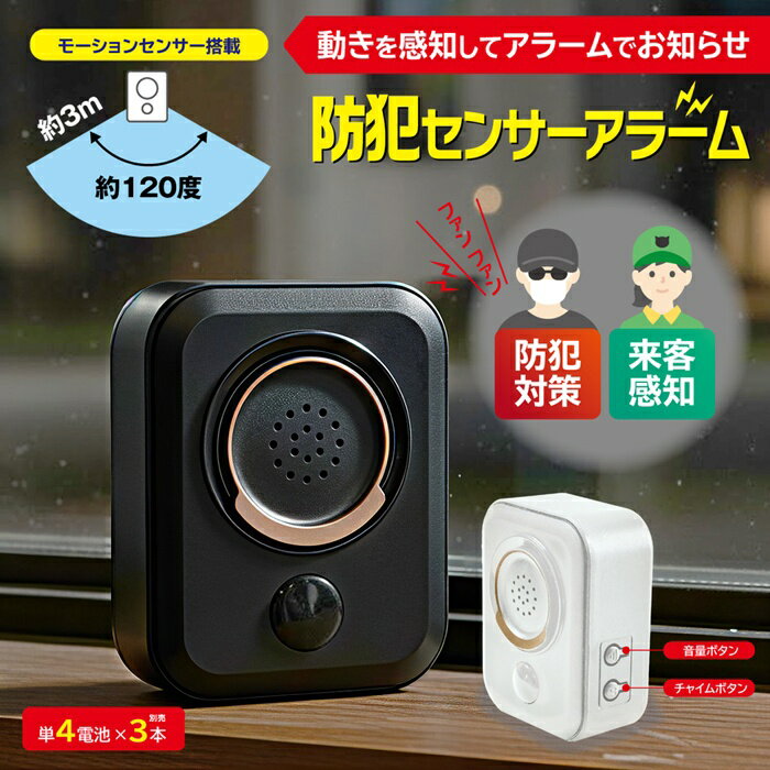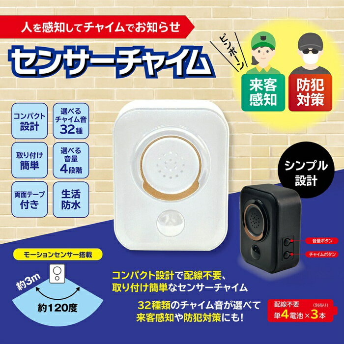 センサーチャイム防犯センサーアラーム 人を感知して音でお知らせ!来客感知・防犯対策に便利! 人を感知してチャイムやアラームでお知らせ! コンパクト設計で配線不要。 取り付け簡単な人感センサー搭載モデル。 選べるチャイム音全32種類で、来客感知や防犯対策、生活防水にも対応! ■ 特長 ● 配線不要の簡単設置タイプ ● 選べるチャイム音32種類 ● 感知距離約3m/感知角度約120度 ● 音量4段階調整機能付き ● 雨や湿気にも安心の生活防水仕様 ● 両面テープ付きで壁や玄関などにすぐ設置OK ● 電池式(単4電池×3本使用)でどこでも使える ■ 用途いろいろ! ● 玄関や勝手口での来客感知に ● 倉庫やガレージでの防犯対策に ● 店舗や事務所での入退出のお知らせに ● 高齢者やお子さまの動き検知にも便利 コンパクトでシンプルなデザイン。 取り付け場所を選ばず、さまざまなシーンで活躍します。 来客感知にも防犯対策にもこれ一台! 玄関・店舗・倉庫など、 安心と便利をサポートするモーションセンサーアラームです。 防犯・来客感知・簡単設置・電池式チャイムをお探しの方におすすめ! ■ 商品仕様 ■ 本体サイズ 約W56×D29×H73mm パッケージサイズ 約W129×D30×H180mm 本体重量 約50g 材質 プラスチック・鉄 使用電池 単4形アルカリ乾電池3本(別売) 推奨使用環境温度 0~40度 ※ 本製品は2種展開となっており色およびパッケージデザインが異なりますが、機能・仕様は同じです。搭載されている音色も共通です。 ※ 音色32種類のうち、警告音(ファーンファーンという音)を選択した場合、センサー検知後に音が鳴り続け、自動で鳴り止まない仕様となっております。停止させるには、本体の電源をオフにする必要があります。 ※ 乾電池は別売です。付属しません。 ※ 屋内または屋根のある場所で本製品をご使用ください。 ・ 掲載画像はイメージであり、実際の製品とは多少異なる場合があります。 ・ パッケージや個装形態は入荷時期によって変更となる場合があります。 ・ 製品の仕様は品質の向上・改善のため、予告なく変更となる場合があります。