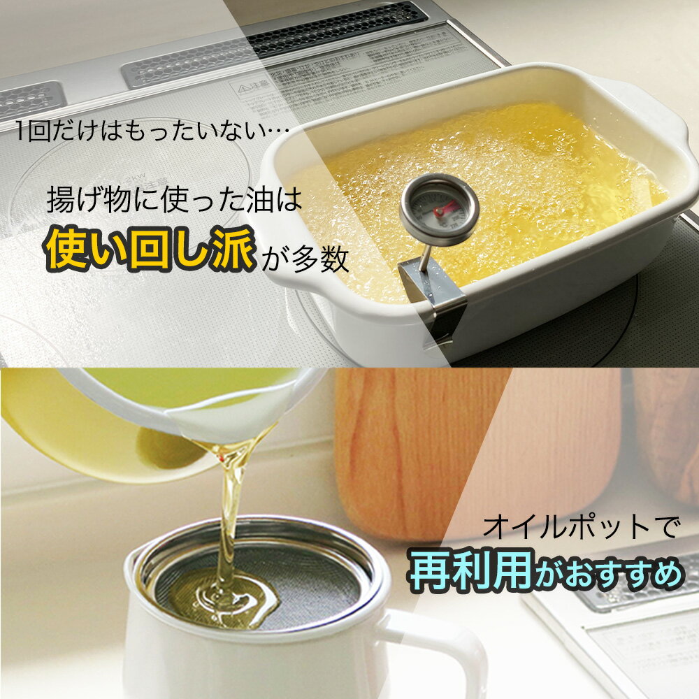 ご案内 ※天ぷら鍋・オイルポットはそれぞれ大きさの異なる箱に入っておりますので、2個口での包装になります。予めご了承ください。 商品説明 ★☆★富士ホーロー 角型天ぷら鍋×オイルポット0.8Lのセット★☆★ ■角型天ぷら鍋 スリムな角型でスタッキングできるバットと油切り用のスノコ網付き。 防水性で丸洗い、水洗いOKな温度計付き! 【材質】 ホーロー用鋼板 【本体サイズ】約25×14.5×9cm 【重量】 約1,020g 【満水容量】1.8L 【適正油量】約600g(約666ml) ※本体に刻印目安あり 【対応熱源】※IH200Vで使用の際はIHの取扱説明書をご確認下さい。 ガスコンロ、IH100V、IH200V、オーブンなど幅広い熱源で使用可能 【生産国】タイ 【その他】温度計以外は食器洗浄機の使用可能 【注意事項】 汚れが付いた状態でご使用になると、焦げてしまう恐れがございます。周りを拭いてからご使用ください。 揚げる際は、具材が浮上するくらいの油が必要です。 具材が多い・具材が浮上しない状態で火にかけると鍋底にこびりついてしまう場合がございます。 ●揚げ物モードの使用不可● ※※揚げ物調理の際はご使用のIHの取扱説明書をよくお読み下さい※※ 揚げ物モードなどを使用した際に、急激に温度が上昇するとIHがエラーとなる場合がございます。 通常の加熱で必ずレベルを「中」以下でご使用のうえ、付属の温度計で油の温度管理をお願いいたします。 ●温度計について● ※仕様変更により商品画像と異なるデザインの温度計が届く場合がございます。何卒ご了承ください。 IHやコンロなどの温度も誤差があり使用する環境により違ってくることが多い為、温度計と同じ温度表示にならない場合がございます。 お届けした時点では温度は約20度を示しております。 ■オイルポット0.8L(活性炭カートリッジ付) 調理油の再利用にはかかせないアイテム。 活性炭カートリッジは約10回程度繰り返し使用ができ経済的です(油の汚れ具合で使用回数は異なります) 【材質】 本体:ホーロー用鋼板/こし網・活性炭アダプター:ステンレス/カートリッジ:活性炭入り不織布 【サイズ】 約幅15×高18.5×径11cm/カートリッジ:約径9×高3cm 【重量】 約650g 【適正容量】 約0.8L 【満水容量】 約1.39L 【生産国】 本体:タイ/カートリッジ・枠網:日本 【使用上の注意】 ホーロー製品は落としたりぶつけたりしますと破損の原因となります。 食器洗浄乾燥機を使用しての洗浄・乾燥は、ホーローがはがれてしまうおそれがありますのでご注意ください。 【メーカー】富士ホーロー株式会社 ---------------------------------------------------------------- ■ご購入前に琺瑯の特性についてご一読下さい。 琺瑯商品は職人の手によってひとつひとつ作られております。 製造工程上、縁には釉薬がかかりにくく、塗りムラにより縁部分や表面にスジや点が見られます。 釉薬を焼き付ける際に、本体を金属で吊すため、縁の裏側に吊り金具の跡が残ります。 焼成時に高温の炉内で粉塵(黒点)が付着する場合があります。 いずれもご使用に差し支えございませんので安心してお使いください。 また、底面に印字される[富士ホーロー]のロゴにつきましても、1点1点ゴム印で手押ししておりますので、印字の擦れなどが見受けられる場合がございます。 この様な理由での[返品・交換]はお受けすることが出来かねますので、予めご了承とご理解の上、ご注文を賜りたくお願い申し上げます。 ----------------------------------------------------------------単品購入はこちら 角型天ぷら鍋 オイルポット0.8L 活性炭カートリッジはこちら 3個入り 6個入り 12個入り