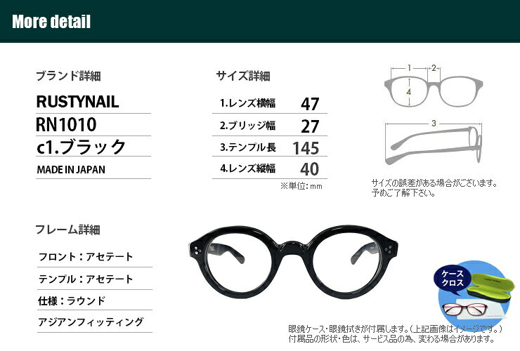 フレームの詳細 ブランド RUSTY NAIL(ラスティ・ネイル) 品番・カラー RN1010 ※在庫がない場合があります。 C1 ブラック C2 ブラウンデミ C3 レッド C4 クリアイエロー サイズ 1) レンズ横幅:47mm 2) ブリッジ幅:26mm 3) テンプルの長さ:145mm 4) レンズ縦幅:40mm 5) 表記サイズ:47□26-145(H40) 素材・仕様 アセテート(フロント・テンプル) 参考定価 28,600円(税込) レンズ加工 日本・鯖江(メガネショップzigen) 製造・調整・仕上げ 日本・鯖江(SABAE WORKS) 付属品 ソフトケース・眼鏡拭き・取扱説明書 (※保証書ではありません) おすすめの性別 男性 メンズ men's 紳士 UNISEX DESIGN/男女兼用 ●レンズの詳細 レンズ種類 HOYA 視力補正用薄型レンズ メーカー HOYAビジョンケアカンパニー ニコンレンズウエア 他など 素材・屈折率 UVカット標準装備プラスチックレンズ 1.60 薄型単焦点メガネレンズ コーティング ハードコート(キズ防止コート) マルチコート(反射防止コート) 水やけ防止コート ハイビジョン仕様 参考定価 15,400円(2枚1組/税込) レンズ加工 日本・鯖江(メガネショップzigen) 調整・仕上げ 日本・鯖江(SABAE WORKS) レンズの詳細 レンズ種類 視力補正用累進レンズ メーカー HOYAビジョンケアカンパニー ニコンレンズウエア 他など 素材・屈折率 UVカット標準装備プラスチックレンズ 1.60 内面累進設計 多焦点 コーティング ハードコート(キズ防止コート) マルチコート(反射防止コート) 撥水・水やけ防止コート ハイビジョン仕様 参考定価 22,000円(2枚1組/税込) レンズ加工 日本・鯖江(メガネショップzigen) 調整・仕上げ 日本・鯖江(SABAE WORKS) クイックリンク 遠近両用メガネ 遠近両用タイプはこちらから 老眼鏡 老眼鏡はこちらからヴィンテージ感の漂うRUSTY NAIL 『ラスティ・ネイル』のこだわりのデザイン! 一貫したデザインコンセプトの基に企画・数量限定でHand madeされた『RUSTY NAIL』。 メガネ黄金期である1950~60年代のアメリカのデザインを現代風にアレンジしたコレクション。 クラッシック・ヴィンテージ・個性派デザインにこだわる方に! 掛けると意外に顔馴染みが良く、年齢・性別・着用シーンを選ばないオールマイティーさもが魅力。 ラスティネイルはオシャレでイケおじ必須のこだわりデザイン! 流行デザインなので老眼鏡・遠近両用メガネのイメージがなく、老眼シーンもおしゃれにかけていただけます。 老眼鏡ユーザー・老眼鏡ヘビーユーザーにも変わらず人気ですが、はじめて老眼鏡をご利用になる方や、とりあえず老眼鏡をお試ししたい方にもお勧めの老眼鏡 遠近両用メガネセットです。 リビング・ダイニング・ベッドルーム・オフィスなど、各部屋に1本づつ老眼鏡や遠近両用メガネを置いたり、車やバックの中にも入れて、便利に老眼鏡や遠近両用メガネをお使い下さい。 ●視力補正用レンズをオーダーしますので、左右違いの度数も対応可能です。 ●近視・乱視度数やブルーライトカットコートは、有料のオプションレンズにて対応いたします。 ●レンズはオーダー品の為、ご注文後の度数の変更、キャンセルはできません。 ●遠近両用メガネのレンズ特性をご理解いただける方のみご利用下さい。 ●遠近両用メガネは、遠用重視の眼鏡(常用のメガネ)となります。 ●遠用度なしの設定の場合、レンズ特性や掛け方によっては、度なしであっても極微量の度数が感じられる場合があります。 ●長時間のデスクワークや主にパソコン画面を見る場合は遠近両用メガネは不向きです。 ●遠近両用レンズは、設計上どうしてもユレ・歪みを感じる部分があります。 ●レンズは特注オーダー品の為、ご注文後の度数の変更、キャンセルはできません。