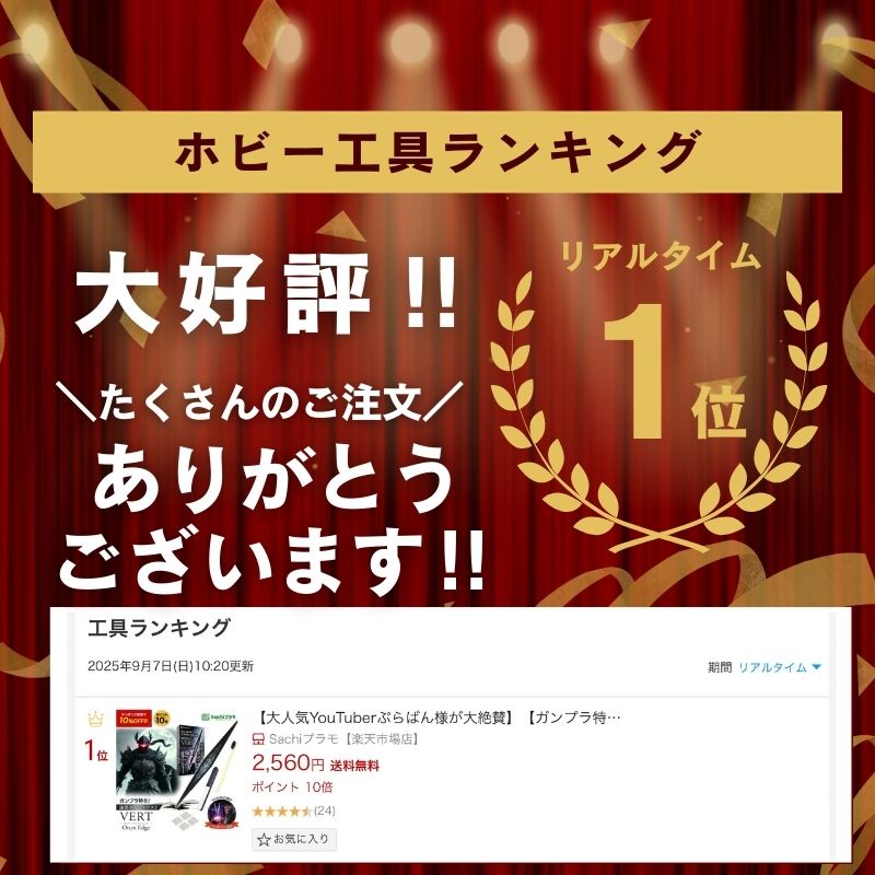 商品説明 スタイリッシュな漆黒デザインと極細の先端が魅力の『VERTヤスリ Onyx Edge』は、プラモデルのゲート処理に特化したプロ仕様のガラスヤスリです。 両端が鋭く細く加工されており、狭い隙間や細部にも無理なくアクセス可能。削りすぎを防ぐ繊細な研磨力と均一な仕上がりを実現します。 さらに、高耐久ガラス素材を採用しており、ゲートカット後はOnyx Edgeだけで処理が完結。大幅な時短と高精度な仕上がりを同時に叶えます。 水研ぎにも対応し、仕上げの質をさらに向上。錆びる心配がないため、繰り返し使用しても性能は長持ちします。 ブラシ・調整用スポンジ・研磨パッドなど便利な付属アイテムも充実。コンパクトながらしっかり握れるフォルムで操作性も抜群です。 「削る」作業が、「仕上げる」快感へ──。 『VERT Onyx Edge』で、プラモデル製作の精度と美しさをワンランクアップさせましょう! \ おすすめの使い方 / ●プラモデルのゲート処理に ●プラモデルやフィギュアの成形に ●レジンパーツの処理に ●爪ヤスリに 素材 強化ガラス 生産国 中国 梱包サイズ 21 x 12 x 2.5 cm 取り扱い/注意事項 ・ガラス製のため、落とすと割れる可能性があります。使用中や保管時は安定した場所で扱い、滑りにくい環境で作業してください。 ・VERTヤスリは軽い力で研磨できるよう設計されています。強く押し付けると破損する原因になるため、優しく削ることを意識しましょう。 ・硬いものにぶつけたり、曲がる方向に負荷がかかると割れや欠けが生じる可能性があります。使用後は専用ケースや柔らかい布で包んで保管しましょう。 ・使用後は、ブラシや水洗い、粘着シート等で研磨面の粉塵を落としてください。目詰まりが少なく長く使える設計ですが、定期的なクリーニングでさらに快適に使用できます。 ・割れた際に破片が鋭利になる可能性があるため、お子様のいる環境では安全な場所に保管してください。 関連キーワード sachi vert サチプラモ sachiプラモ vertヤスリ ガンプラ ガラスヤスリ ヤスリ やすり ガラスやすり プラモデル プラモ 模型 工具 工具セット エアブラシ エアブラシ 充電式 エアーブラシ 工具 充電式エアブラシ エアブラシセット トリガー エアブラシ コンプレッサー ガンプラ mg hg GQuuuuuuX rg ザク ジークアクス サザビー ガンダム 改造 パーツ ゲート処理 塗装 塗装セット 塗装道具 小型 軽量 ペイント プレゼント 贈答用 贈り物 モノアイ 車 戦車 アニメ 塗り おすすめ オプション パーツ 改造 クリア カラー 最新 再販 初心者 種類 スジ 彫り 人気 ジオラマ 部品 目 消 簡単 クリア パーツ 通販 レジン ツール つなぎ目 ハンド パーツ ヒケ 処理 表面 処理 下地 コツ フレーム 保管 方法 マーキング シール 貼り 方 マーカー 魔 改造 水 転写 デカール 緑 ミニ サイズ 変形 ニッパー 無料 配布 メッキ 面 出し モールド 目 モールド 彫り 直し ランナー ドライ ブラシ バリ取り 武器 ヤスリ がけ 汚し プロ キット 目 光らせる ピンセット モールド 道具 ハンドメイド レジン 超極細 仕上げ 削りすぎ防止 水研ぎ可能 模型工具 フィニッシュプラモデル ツール 簡単 プロ仕様 パーティングライン除去 細かい作業向け 手軽に仕上げ 高耐久 送料無料 男性 プレゼント 母の日 プレゼント 母の日ギフト 恋人 友達 キッズ 子供 父 母 プレゼント ギフト 敬老の日 セール 家庭用 公式 実用的 成人の日 成人式 バレンタイン バレンタインデー ホワイトデー 卒業式 入学式 父の日 敬老の日 クリスマス 誕生日 還暦祝い お祝い 合格 ギフト プレゼント 母の日ギフト 父の日ギフト 父の日 御中元 お中元 お土産 手土産 贈りもの 子どもの日 こどもの日 夏休み 工作 大人 還暦祝い フィギュア 収納 収納ケース ケース 洗える ニッパー クリーニング 高品質 ネイル 爪ヤスリ ガラス製 ヤスリ 緻密 細部 やすり 爪 手 足★当店一押し商品★