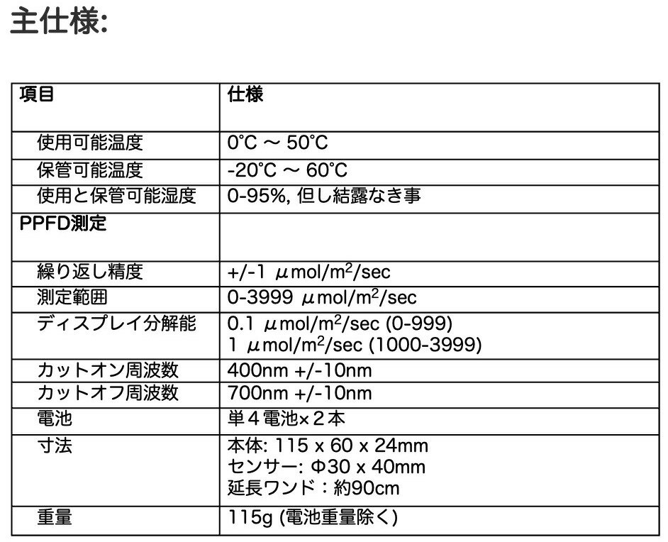 サンゴや植物の光合成に必要な光の量である光合成有効放射束(PAR)を測定できる機器です。 センサーは水中使用可能で、約90cmの長さのワンドが付属しておりますので、水槽の端やライブロック等の影部分のデッドスポットの光量測定も可能です。 優れた受光センサー特性により、サンゴや植物が光合成で利用できる400~700nmの光のエネルギーを光合成有効放射(Photosynthetically active radiation、PAR)を正確に測定する事が出来ます。 【製品の特徴】 植物・サンゴの光合成に有効なPPFDを測定可能 太陽光/人工光の両方を測定可能 防水外部センサー式でコード長2m 防水ワンド(約90cm)付属 軽量、コンパクト設計で取扱いし易い 表示単位は、μmol/m^2/s ですサンゴや植物の光合成に必要な光の量である光合成有効放射束(PAR)を測定できる機器です。 センサーは水中使用可能で、約90cmの長さのワンドが付属しておりますので、水槽の端やライブロック等の影部分のデッドスポットの光量測定も可能です。 優れた受光センサー特性により、サンゴや植物が光合成で利用できる400~700nmの光のエネルギーを光合成有効放射(Photosynthetically active radiation、PAR)を正確に測定する事が出来ます。 【製品の特徴】 植物・サンゴの光合成に有効なPPFDを測定可能 太陽光/人工光の両方を測定可能 防水外部センサー式でコード長2m 防水ワンド(約90cm)付属 軽量、コンパクト設計で取扱いし易い 表示単位は、μmol/m^2/s です