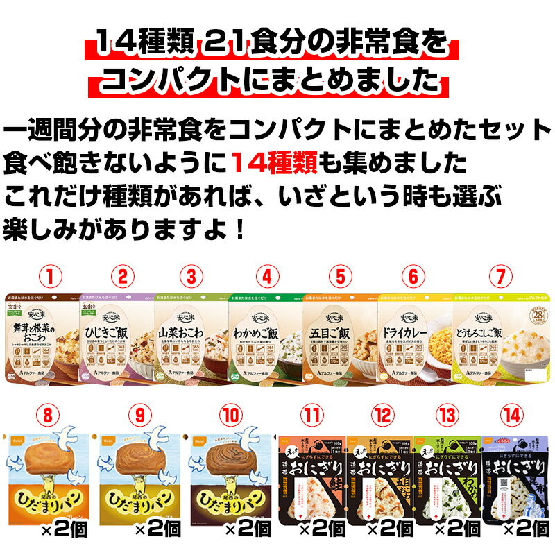 非常食7日間コンパクトセット 賞味期限 【製造から5年】 アルファ米・保存パン※流通の段階で多少のお時間がかかるため、お手元に届く際には賞味期限が5年を切る場合もございます(賞味期限4年6ヶ月以上を保証) 内 容 量 【アルファ米】 ・安心米 ドライカレー 1食 ・安心米 山菜おこわ 1食 ・安心米 とうもろこしご飯 1食 ・安心米 舞茸と根菜のおこわ 1食 ・安心米 ひじきご飯 玄米入り 1食 ・安心米 五目ご飯 1食 ・安心米 わかめご飯 1食 ・携帯おにぎり わかめ 2食 ・携帯おにぎり 五目おこわ2食 ・携帯おにぎり 昆布2食 ・携帯おにぎり 鮭 2食 ※在庫状況によって変更になる場合があります。 【長期保存パン】 ・ひだまりパン プレーン 2食 ・ひだまりパン チョコ 2食 ・ひだまりパン メープル 2食 ※在庫状況によって変更になる場合があります。 保存方法 常温 原産国 国産 製造者 【安心米各種】 アルファー食品株式会社 東京都中央区日本橋堀留町1-2-10 【ひだまりパン おにぎり各種】 尾西食品株式会社 東京都港区三田3-4-2 いちご聖坂ビル3階 原材料 各単品販売ページにてご確認ください アルファ米:ドライカレー・ えびピラフ・チキンライス・五目ごはん・わかめごはん・山菜おこわ パン缶:オレンジ・コーヒー・黒糖・プレーン
