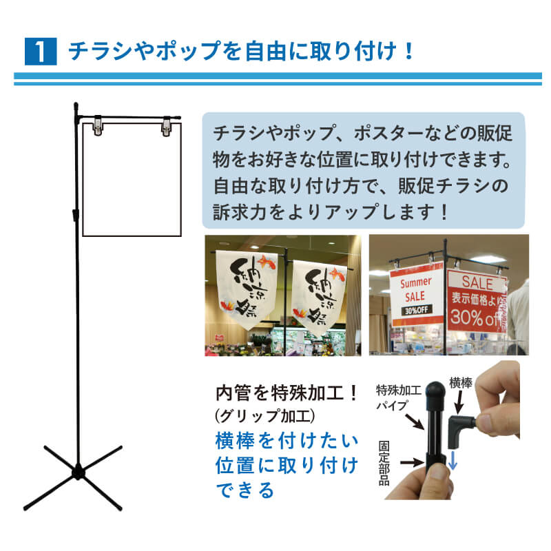 よく一緒に購入されている商品daim グリップポップスタンド用部品 横棒セ398円daim グリップポップスタンド ライト 1台2,200円 類似商品はこちらdaim グリップポップスタンド ライト 1台2,200円daim グリップポップスタンド 10台入 124,800円daim グリップポップスタンド 2台入 1.5,980円daim グリップポップスタンド用部品 横棒セ398円daim 組立式 卓上イベントポスタースタンド2,980円daim ポスタースタンド A1 A2 対応 2,980円daim 組立式 イベントのぼりスタンド 高さ2,980円daim 注水式 のぼり竿用スタンド 11L 5,000円daim 注水式 のぼり竿用スタンド 11L 1,100円新着商品はこちら2025/8/6daim 組立式 卓上イベントポスタースタンド2,980円2025/7/30daim 日本製 2.4m伸縮のぼり竿 ホワイ2,000円~2025/7/19daim 組立式 イベントのぼりスタンド 高さ2,980円再販商品はこちら2025/11/14daim 鳥よけシート 40枚入 鳥よけ トゲ13,060円2025/11/8daim 注水式 のぼり竿用スタンド 16L 5,900円2025/11/8daim 猫よけ 猫除け ここダメシート 幅310,800円2025/11/28 更新 商品概要 商品名 daim グリップポップスタンド ライト 10台入り 仕様・特徴 ・約900gでとっても軽く、倒れにくく持ち運びや設置がラク! ・高さ1.3m〜2.4mまで伸縮できるフロアスタンドです。 ・ブラックを基調にしているので、景観を損なわずに設置できます。 ・横棒は差し込み式で、簡単に取り付けられます。 ・お好みの高さ、角度に自由に調節して販促物を掲示できます。 サイズ(約) ・パイプ …高さ 1.3m〜2.4m(伸縮式) …内管外径 φ13mm/外管外径 φ16mm ・横棒 …長さ 42cm ・スタンド …28cm×45cm セット内容 10台 1台あたり ・パイプ …1本 ・横棒 …1本 ・固定部品 …1個 ・クリップ …2個 ・脚パイプ …4枚 ・5方向部品 …2個 用途 ポスターやチラシなどの販促物の取り付けに。感染対策のパーテーションや間仕切りとしても 別売り部品 グリップポップスタンド専用の部品 (こちらはグリップポップスタンドライトにもご使用いただけます。) ・横棒セット(1本入り) 関連商品 のぼり旗用スタンド スタンディングポール1セット入 スタンディングポール10セット入 のぼり旗用ポール のぼり用ポール伸縮式3m 和風のぼり用ポール のぼり旗まくれ上がり防止パーツ くるナビ22型 くるナビ25型 のぼりポール用スタンド かんたんポールスタンド1セット入 かんたんポールスタンド5セット入 かんたんポールスタンド10セット入 注水式のぼり竿用スタンド11L1個入り 注水式のぼり竿用スタンド11L5個入り 注水式のぼり竿用スタンド16L1個入り 注水式のぼり竿用スタンド16L5個入り 注水式のぼり竿用スタンド20L1個入り 注水式のぼり竿用スタンド20L5個入り スマートスタンド1セット入り スマートスタンド2セット入り スマートスタンド5セット入り ポップスタンド グリップポップスタンド2台入 グリップポップスタンド10台入 グリップポップスタンドライト1台入 グリップポップスタンドライト10台入 注意事項 ・本商品は屋内用です。屋外では使用できません。 ・横棒は1本のみ付属しております。 ・A3サイズ程度のPOPの取り付けを想定して設計しております。それ以上の大きさの販促物を取り付ける場合、足元に重りを置くなどして、お客様で転倒対策をお願いいたします。