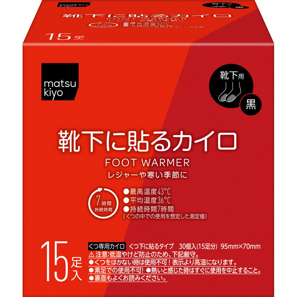 製品説明 製品詳細 〇くつ下に貼るタイプの足元用カイロ 〇足うらにピタッと広く温める* *桐灰カイロ くつ下用貼るとの比較 〇足うら全体に貼って使用するタイプ 〇濃い色の靴下に目立たず使えます。 〇薄さ約2mm 〇ずっと発熱9時間 〇消臭剤配合 規格 最高温度 : 45℃ 平均温度 : 37℃ 持続時間 : 9時間(くつの中での使用を想定した測定値)(カイロ工業会足元用カイロ統一試験法による測定値ですので人体にてご使用の場合は若干の差異があります。) サイズ : 7.2cm×20cm 原材料 鉄粉、水、活性炭、吸水性樹脂、バーミキュライト、塩類 使用上の注意 ※使用上の注意をよく読み安全にご使用ください。 <低温やけど防止のための注意> ・低温やけどは、体温より高い温度の発熱体を長時間あてていると紅班、水疱等の症状をおこすやけどを言う。なお、自覚症状をともなわないで低温やけどになる場合もあるので注意する。 ・くつ以外では使用しない。 ・スリッパやサンダル、サイズが大きいくつ等、空気の入りやすい履物では高温になることがあるため使用しない。 ・就寝時は使用しない。 ・他の暖房器具との併用は高温になるため使用しない。 ・足のつま先裏側以外には使用しない。 ・ジョギング等スポーツをするときには使用しない。 ・糖尿病など、温感および血行に障害のある方は使用しない。 ・幼児又は身体の不自由な方など本人の対応が困難な場合は使用しない。 ・熱いと感じた時はすぐにはがす。 ・熱いと感じた時にすぐにはがせない状態での使用はさける。 ・片足に同時に複数枚使用しない。 ・肌の弱い方は特に低温やけどに注意する。 ・肌に直接貼らない。 ・万一やけどの症状があらわれた場合はすぐに使用を中止し、医師に相談する。 <その他の注意> ・使用後はすぐにはがす。 ・使用後や貼り直しをするときはくつ下などを傷めないようカイロとくつ下の間に指を入れてゆっくりとはがす。 ・歩き方などには個人差があり、使用中カイロが変形して破れ、くつの中を汚すことがあるので注意する。 ・ブーツ等空気の入りにくいくつや、非常に寒い環境下では発熱しにくい場合がある。 ・くつを履いていない状態では高温になり膨らむことがある。 用途外には使用しない。 ・小児、認知症の方などの誤食に注意する。 ・使用後は、市区町村の区分に従って捨てる。 メーカー 小林製薬株式会社 桐灰化学 【お取り寄せ品】※メーカー側で予告なくデザインを変更する場合がございます。 ※配送先が沖縄県・離島の場合、別途運賃が発生いたします。 ※店舗側でご注文を確認後、配送料をお知らせいたします。