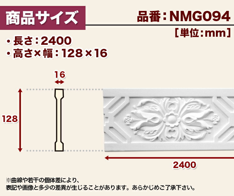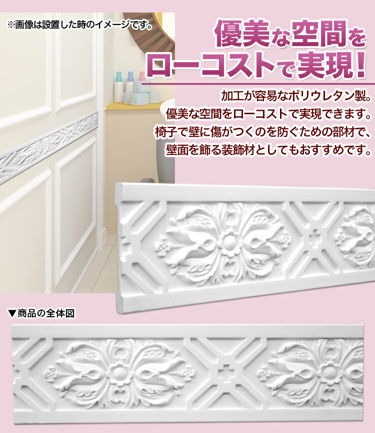 おすすめポイント ★チェアレールを使って壁の中央のアクセントや額縁作りに 壁材の繋ぎ目を隠したり、アクセントをつけたりするために、壁の中央部に貼る装飾材です。コーナーフレームと組合わせてピクチャーフレームにもご使用いただけます。 商品仕様 ■商品コード NMG094(旧商品コード:G094) ■材質 ポリウレタン ■サイズ 高さ・幅・長さ:128×16×2400mm ※高さ・幅は個体によって若干の誤差が出る場合があります。 ※長さは最大で +10mm〜 -20mm程度の個体差があります。(最低保証サイズ:長さ2350mm) ■塗装有無 表面は下地塗装済み※水性塗料で仕上塗装をしてお使いください。 注文時の注意事項 ■色味に若干の個体差があります。 ■お客様がご使用のPCやモバイルのモニター環境により、本サイトに掲載の写真と実物の色味や質感が異なる場合がございます。 ■ポリウレタンの特性として、成形後、0.4〜0.7%程度収縮します。 このため、生産時期、生産ロットによって、断面形状や寸法に誤差が生じる恐れがあります。 ■直材同士の接続や留め加工、または直材とコーナー材・装飾材などと接続する時に面形状が一致せず、面ズレが発生する場合があります。また、施工後の製品の収縮によって隙間が生じる場合があります。 ■水性塗料で仕上塗装をしてお使いください。 ■接着剤(併用ビス止め)または、フィニッシュタッカー、ビス留めで取り付けてください。ゴールデンモールシリーズ 【NMG094】 チェアレール 商品名 チェアレール 品番 NMG094 サイズ(mm) 128×16×2400mm 重量 - 素材・材質 ポリウレタン製 主要用途 内装用 備考 下地塗装済(表面) 送料 チェアレール 壁の保護と装飾の為のモールディング コーナーフレーム チェアレールと組合せで額縁に 廻り縁 天井と壁の境目を飾る廻り縁。