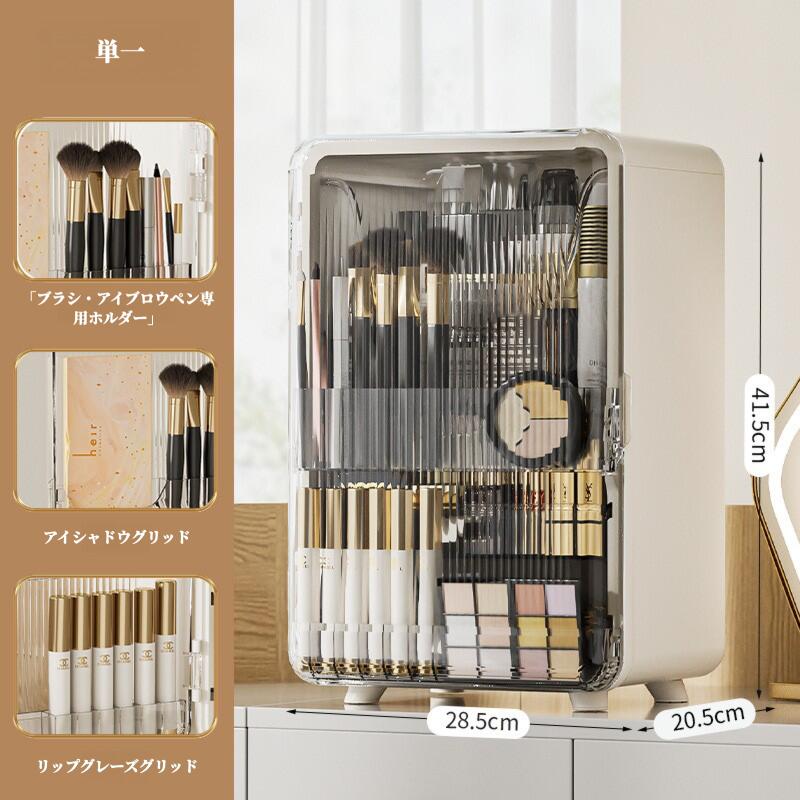 防塵・防水の安心設計 クリアカバー&密閉式引き出しでホコリや水滴から化粧品をしっかりガード。バスルームや洗面所に置いても安心して使用でき、大切なコスメを常に清潔に保ちます。 大容量で使いやすい3段収納 化粧水・乳液・クリームなどのボトル類からリップ・アイシャドウ・パウダーまで、種類ごとに整理可能。高さ8.2インチまでのボトルに対応し、側面にはブラシやリップスティック専用スペースも搭載。 組み立て不要&簡単設置 完全に組み立て済みでお届け。届いたその日からすぐに収納スタート可能。工具や面倒な手順は一切不要で、忙しい日常にスムーズに導入できます。 片手でラクラク操作 マグネット式の両開きドアで、片手でもサッと開閉可能。上部から背の高いボトルを取り出すこともでき、毎日のスキンケアやメイクがさらに効率的に。 透明デザインで一目でわかる 中身がすぐ見えるクリア仕様で、探す手間を軽減。コスメを美しくディスプレイしながら整理整頓でき、時短と美観を両立します。 インテリアにも映える高級感 シンプルで洗練されたデザインは、バスルームやドレッサー、オフィスでも上品に馴染みます。機能性とデザイン性を兼ね備えた、毎日使いたくなる収納キャビネットです。 多用途に活躍 コスメはもちろん、クラフト用品や小物収納としても利用可能。寝室・浴室・デスク周りなど、あらゆるシーンで役立つ万能オーガナイザーです。