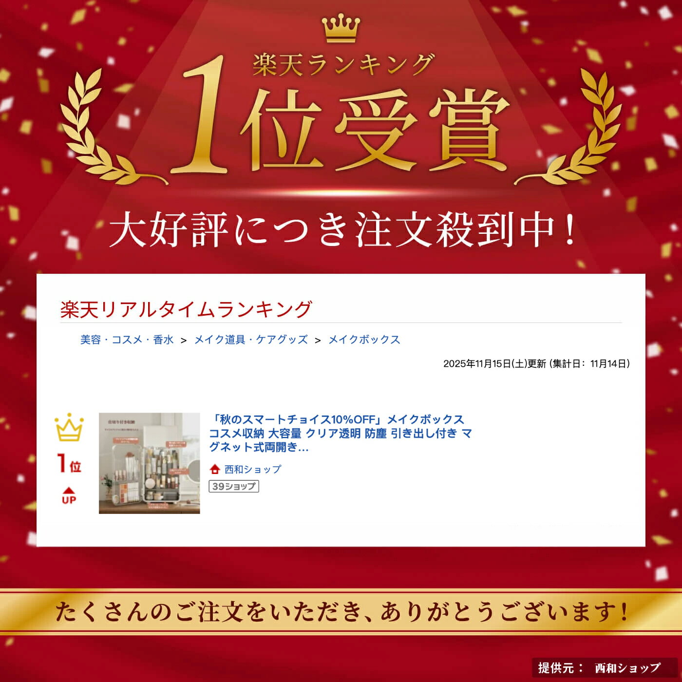 「ブラックフライデーお試し10%OFFクーポン」メイクボックス コスメ収納 大容量 クリア透明 防塵 引き出し付き マグネット式両開きドア 組立不要 滑り止め足付 仕切り付き 化粧品収納ボックス アクセサリーケース 縦縞デザイン ギフト プレゼント
