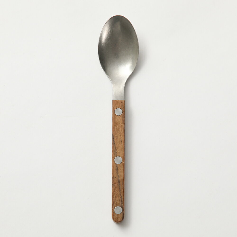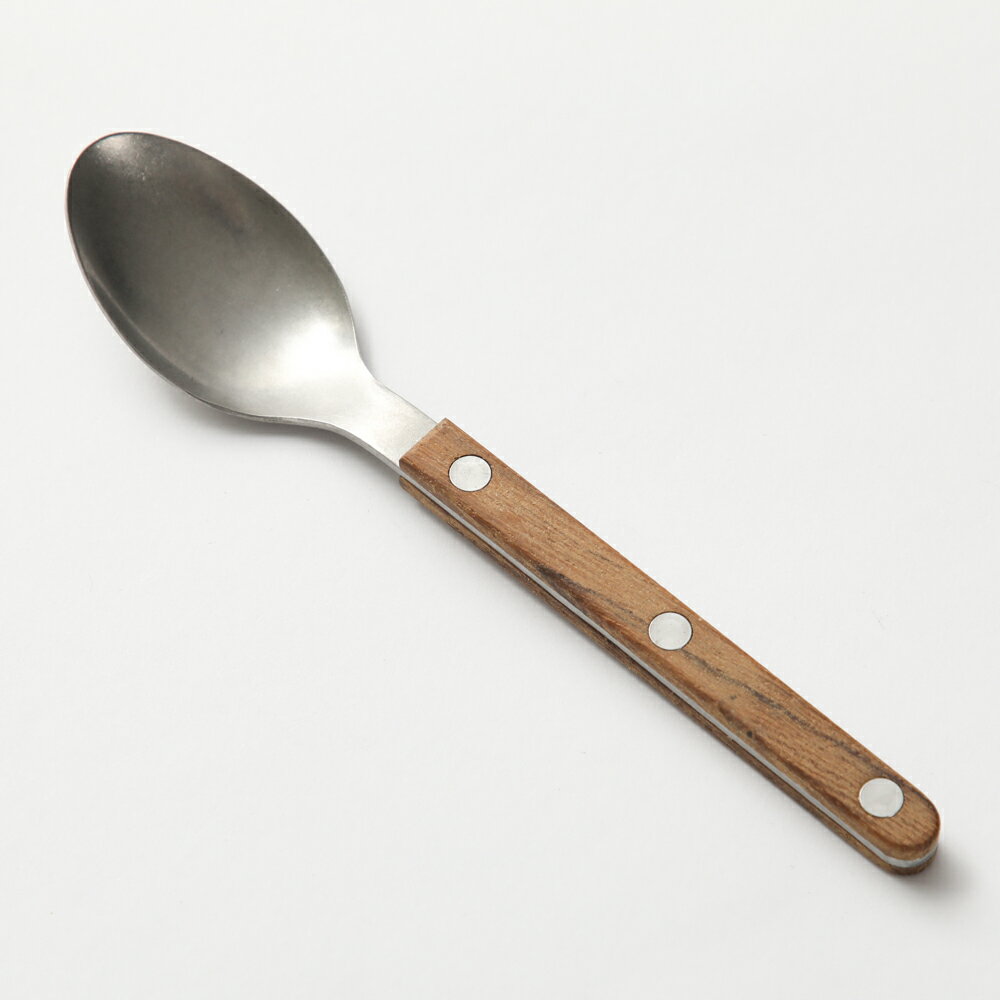【チーク材の自然の風合いが楽しいTeak(チーク)シリーズ】使いやすさと美しさが計算された流れるようなムダのないスリムなフォルムのビストロシリーズの中でも、柄の部分の天然木の自然の風合いが魅力のチークシリーズ。柄の部分は、金属カトラリーをチーク材で上下にサンドイッチし、3つの丸い金属のリベットでボタンのように留められています。 【金属部分は、ヴィンテージマット仕上げ】金属部分はビンテージマット加工されたステンレスで、少しくすんだやわらかい光を放ち、 カトラリー全体のスリムなフォルムとあわさって、かっちり決まりすぎない大人のカジュアルさを演出しています。【使いやすいティースプーン】華奢になりがちなデザートカトラリーも持ったときにしっかりとした安定感があります。少し大きめのティースプーンは、ババロアやプリンなど、大きくすくって楽しみたいデザートにもぴったりです!サイズ:W15×D3cm重量:約31g材質:ステンレス、天然木、ラミネート加工生産国:フランス※天然木を使用しているため、一点ずつ木目や色味が異なります。関連キーワード:カトラリー 食器 ティースプーン レトロ ビンテージ加工 フランス産 フランス製 ステンレス 木柄 ウッドハンドル ウッデン in france▼ 同時に見られている商品 ▼SABRE TEAK VINTAGE ティースプーン