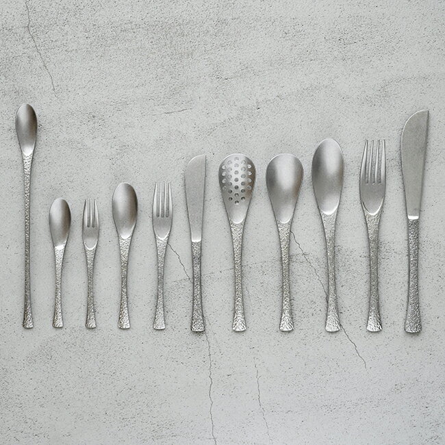鎚目模様が美しい『インパーフェクション』いつもの食卓のカトラリーを変えるだけでテーブルの上を華やかに。和の趣を感じられる今だ人気の鎚目模様。持ち手のデザインは燕市の彫金師に依頼し、試行錯誤を重ねて工業製品として表現。毎日の食事で職人技を身近に感じることができます。毎日の食卓で並び、使い続けることでVINTAGEINOXの特徴の一つ一つ違う独特の風合いが加速します。インパーフェクション デザートスプーンJANコード:4942334559938本体サイズ:L149mm素材:18-8ステンレス生産国:日本▼ 同時に見られている商品 ▼