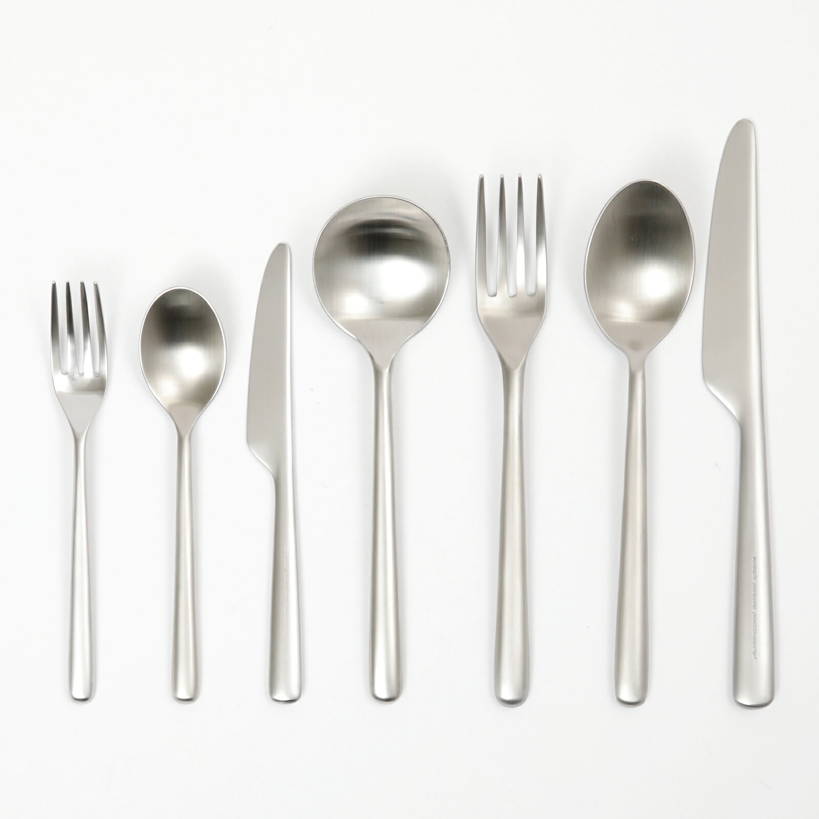 「最適とはなにか」を考えて構築されているブランド「THE」。カトラリーも作っています。国内生産のカトラリーの中では、デザイナーの思いが非常に強い稀有な品の一つです。製造している大泉物産の技術力と探求心、ものづくりへの愛が感じられる美しいカトラリーです。その形状のため少し重みがありますが、しっかりとした持ち心地が好きな方にはおすすめです。不具合を何も感じないことこそが良品という考えもありますが、日常的に使用することで、身の回りの日常品の使い勝手をふと考える──「もの」が好きな方へおすすめの品です。スプーンやフォーク、ナイフなど様々な種類がありますが、カトラリー全般を機能として分解すると、どんな用途のものでも「持ち手」と「先端」に分かれます。「持ち手」は手で扱う部分、「先端」は主に口に触れる部分で「刺す」「切る」などのそれぞれの機能が形状に凝縮されています。カトラリーのデザインを考えたとき、この2つの要素を磨き上げることを必須条件としました。まず、持ち手の共通形状ですが、カトラリーの持ち手の形状は「板状」と「円柱状」に大別できます。改めて様々なカトラリーを使いこむことで気付いたのは、実はカトラリーは手の中で転がす回転運動が多いこと。パスタフォークなどは顕著ですが、スプーンも傾けて使うシーンが多く、フォークに至っては真横にしたり裏返したりする場面もあります。では円柱状が良いのか、というと実はそうでもありません。実際に円柱状のものを使ってみると手の中でくるくると回ってしまってスプーンを水平に保つのも一手間かかります。THE CUTLERYは板と円柱の中間、傾けた状態でも指に接触面が程良く残る楕円形状がベストであると考えました。機能が凝縮された先端部の考え方もシンプルです。基本となるスプーン・フォーク・ナイフの本来の機能に特化し「掬えること・刺さること・切れること」をデザインの指針としました。しっかり刺さるフォークは、お肉を刺して持ち上げたら抜けてしまった、サラダが食べにくい、といったことを解決するために、4本のフォークの刃を立体的にラウンドさせています。外側の2本と中央の2本を段違いにつけることで刺しても抜けにくい形状にするとともに、全体がスプーンのようにくぼんでいることでサラダの豆などちょっとしたものを掬うこともできます。近代の工業化の波が押し寄せる以前、カトラリーの製造は工芸としての鍛冶仕事が主でした。工業化が可能にした板状での製造は低コストで合理的です。しかし、持ち手の形状や全体の重心バランス、それぞれの先端部の加工は、シンプルで小さな変化ですが従来の製造方法では実現できないことでした。THE CUTLERYは、金属材料を多方向からプレスすることで立体的な形状を作っています。旧来の工芸技法と近代の工業技術を掛け合わせることで、カトラリーとして理想の形状を追究しました。その加工を可能にしたのは、新潟県燕市の大泉物産。カイ・ボイスンシリーズなど世界の著名カトラリーを製造するメーカーです。新しい工芸でもあり、新しい工業でもある、THEらしいカトラリーシリーズです。サイズ:20×2.5×2cm素材:ステンレス SUS304生産国:日本関連キーワード:THE CUTLERY ディナーフォーク ミラー 艶あり ツヤあり ツヤなし ヘアライン ザ・カトラリー 箱なし 単品 日本製 大泉物産 シンプル オールステンレス 食洗機対応 燕三条 国産 職人技 カトラリー ナイフ フォーク スプーン スタイリッシュ かっこいい プロダクト デザイン デザイナーズ 新潟県燕市 マット シルバー 鏡面 仕上げ 丸い 長い 細い 繊細 シンプル シルエット モノクロ 4本刃▼ 同時に見られている商品 ▼